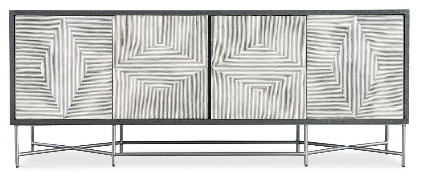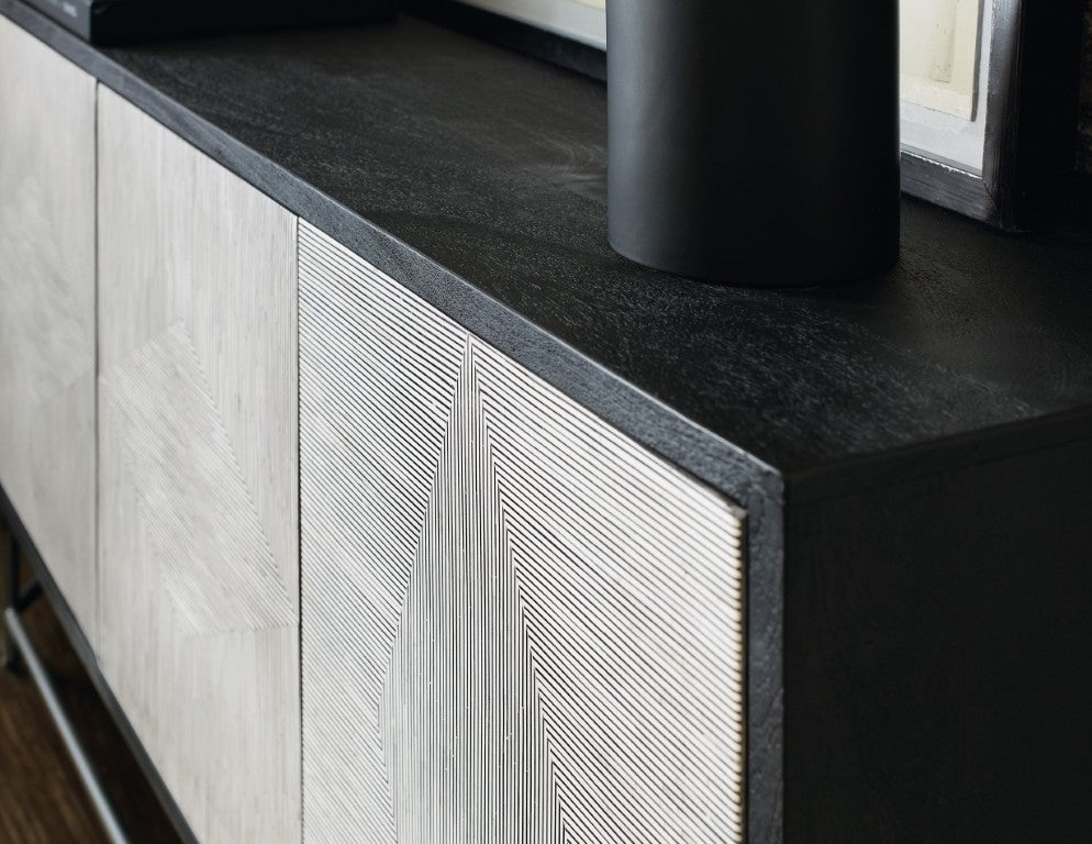 Cool, calm and chic, this credenza blends sculptural detail with practical media functionality to elevate living and entertainment spaces. Crafted from solid mango wood with a striking black-and-white bone inlay on the doors and a brushed pewter metal base, it offers refined storage, soft-close doors, and integrated cable management for a clean, organized look.