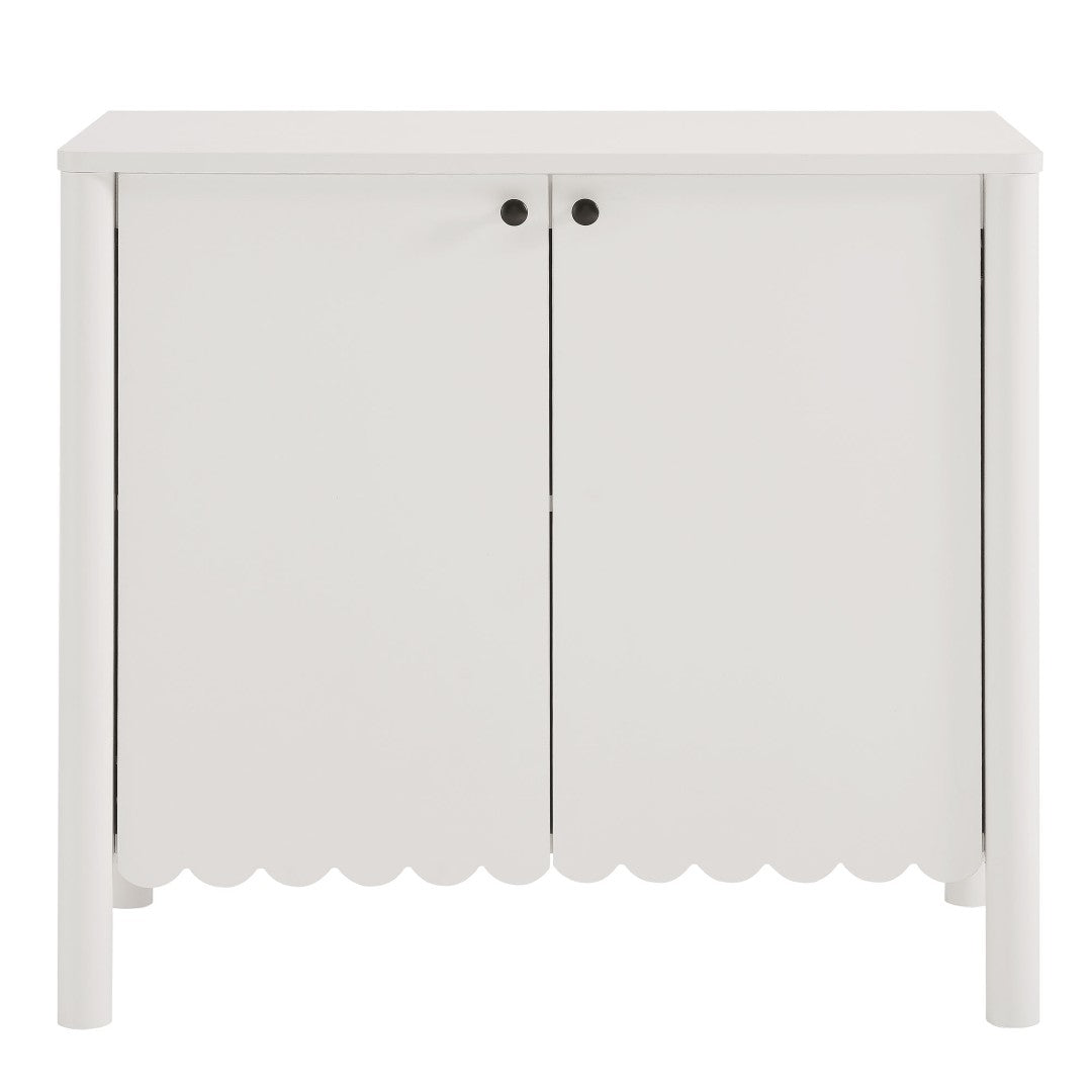 Elevate your living or dining space with the Emmeline scalloped sideboard — a refined blend of modern simplicity and farmhouse charm. Its distinctive scalloped bottom edge and soft curves create a graceful silhouette while delivering thoughtful, functional storage for dinnerware, media accessories, or decorative accents. Built with a sturdy frame and smooth laminate finish, this cabinet balances style and durability and includes soft-close doors and floor-friendly glides for a polished, worry-free presence in any room.
