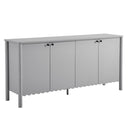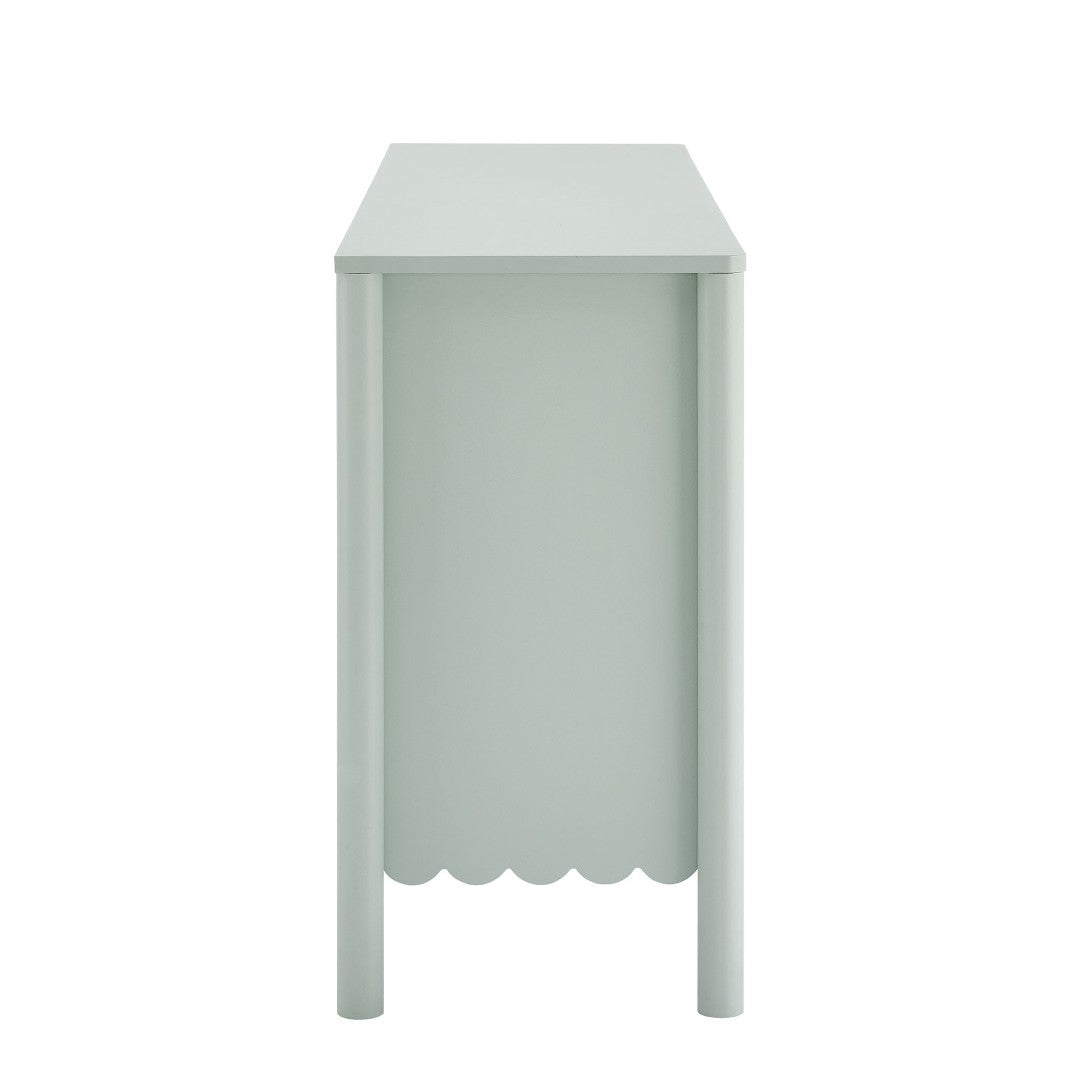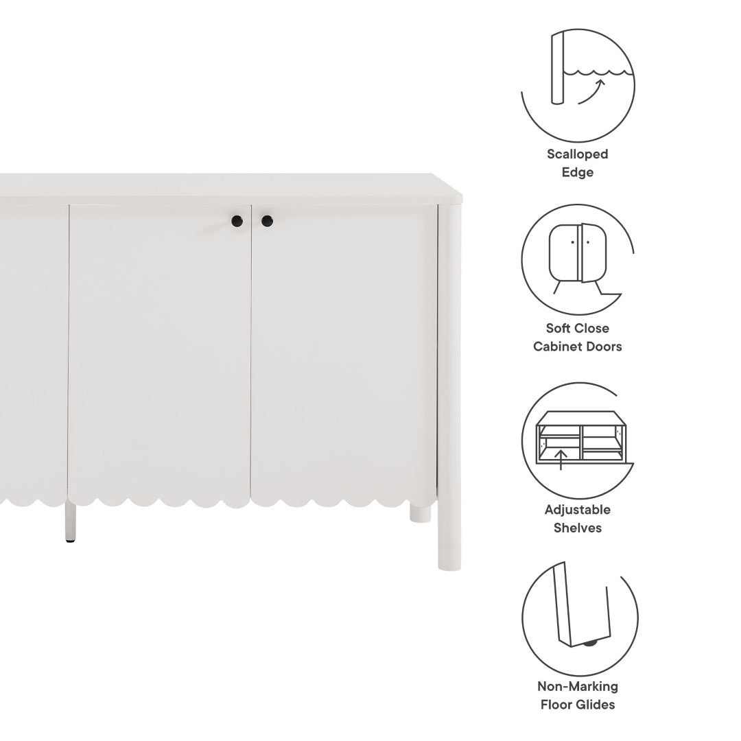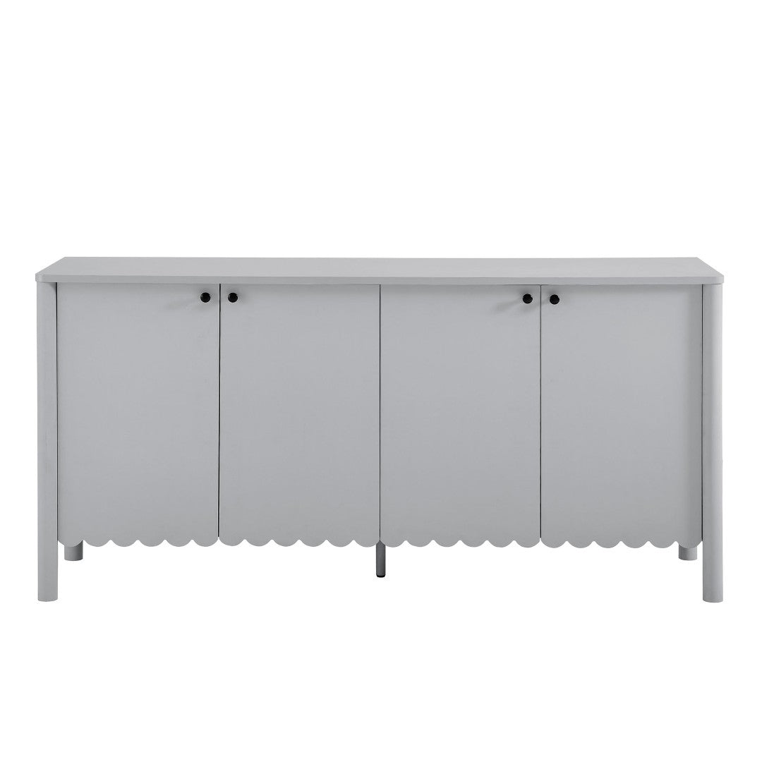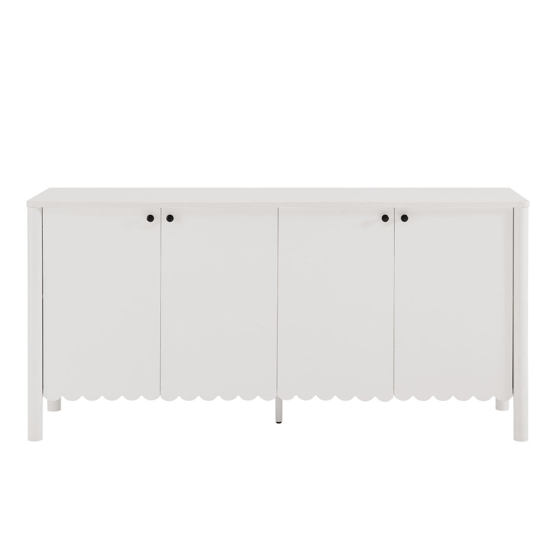 Bring functional elegance to your dining room, entryway, or living space with this sculptural scalloped sideboard. Clean lines and a distinctive wavy bottom edge create a soft, modern silhouette while four soft-close doors and adjustable shelving deliver versatile storage for dinnerware, media, or decorative accents. Durable laminate surfaces, round knobs, and non-marking glides combine to ensure lasting style and floor protection—ideal as a buffet, console, or accent cabinet.