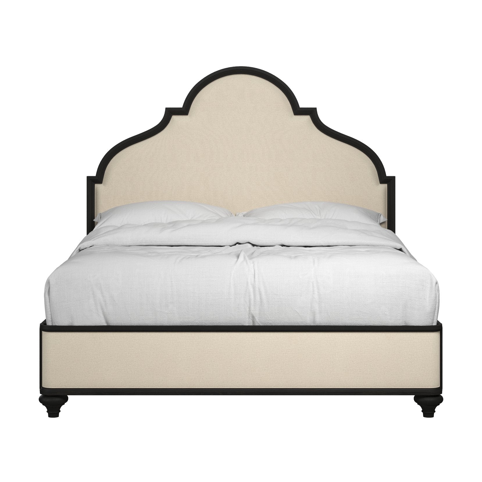 Traditional style steps into the 21st century. Inspired by the neoclassical influence of Louis XVI-era France, the Atrium Panel Bed features scrolled arches with notched corners and turned wood feet that evoke a sense of history. Sleek upholstered panels and solid wood frame with rustic hand-glazed blackened finish give this showstopping bed a modern aesthetic combined with timeless elegance.