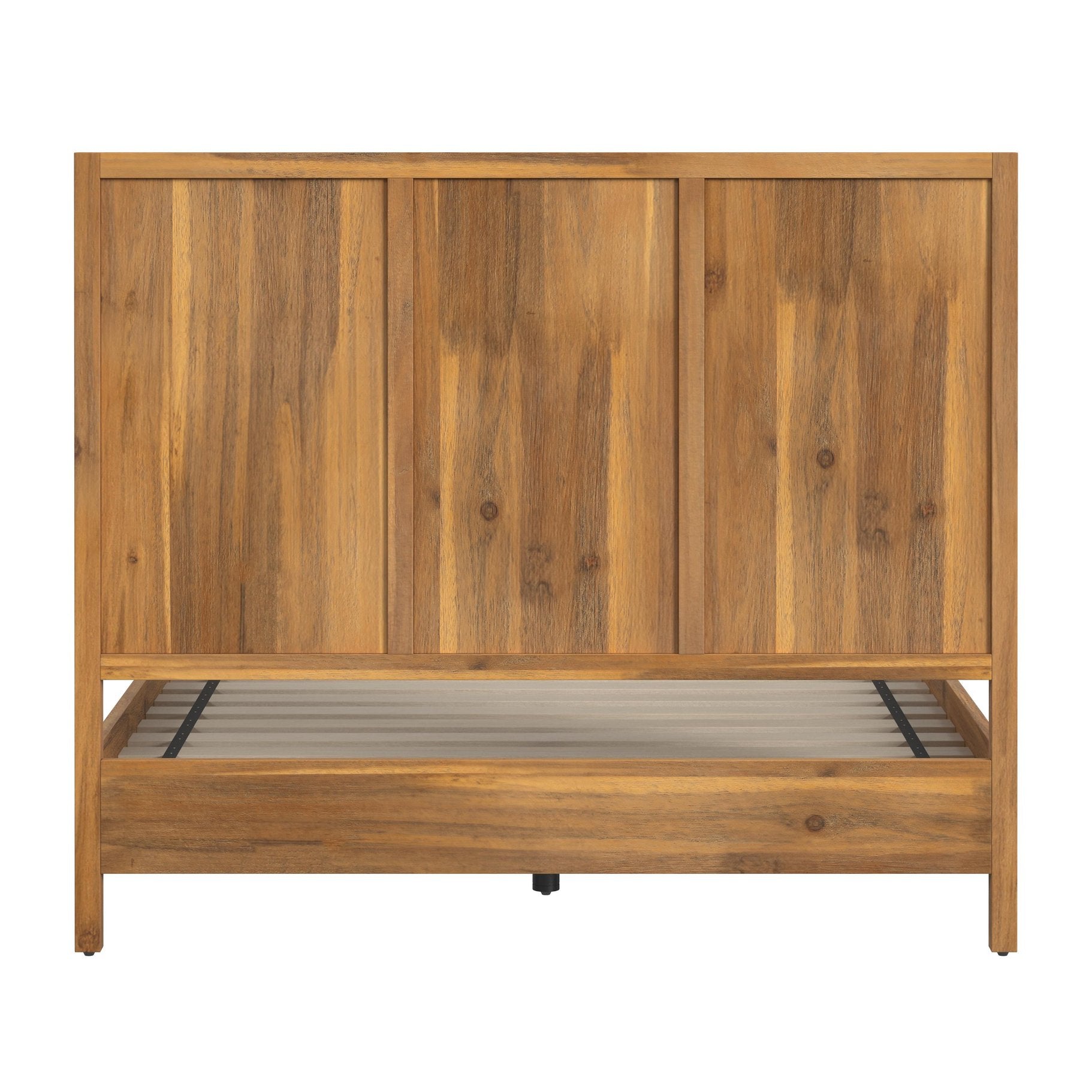 - Product Features (Construction Details): Knock-down construction featuring solid wood and wood veneer with engineered wood components, Tongue and Groove joinery, cross slat support system with metal supporting rail connected by wood screws, and support feet attach to the metal bar by bolt and feature adjust lever on bottom.