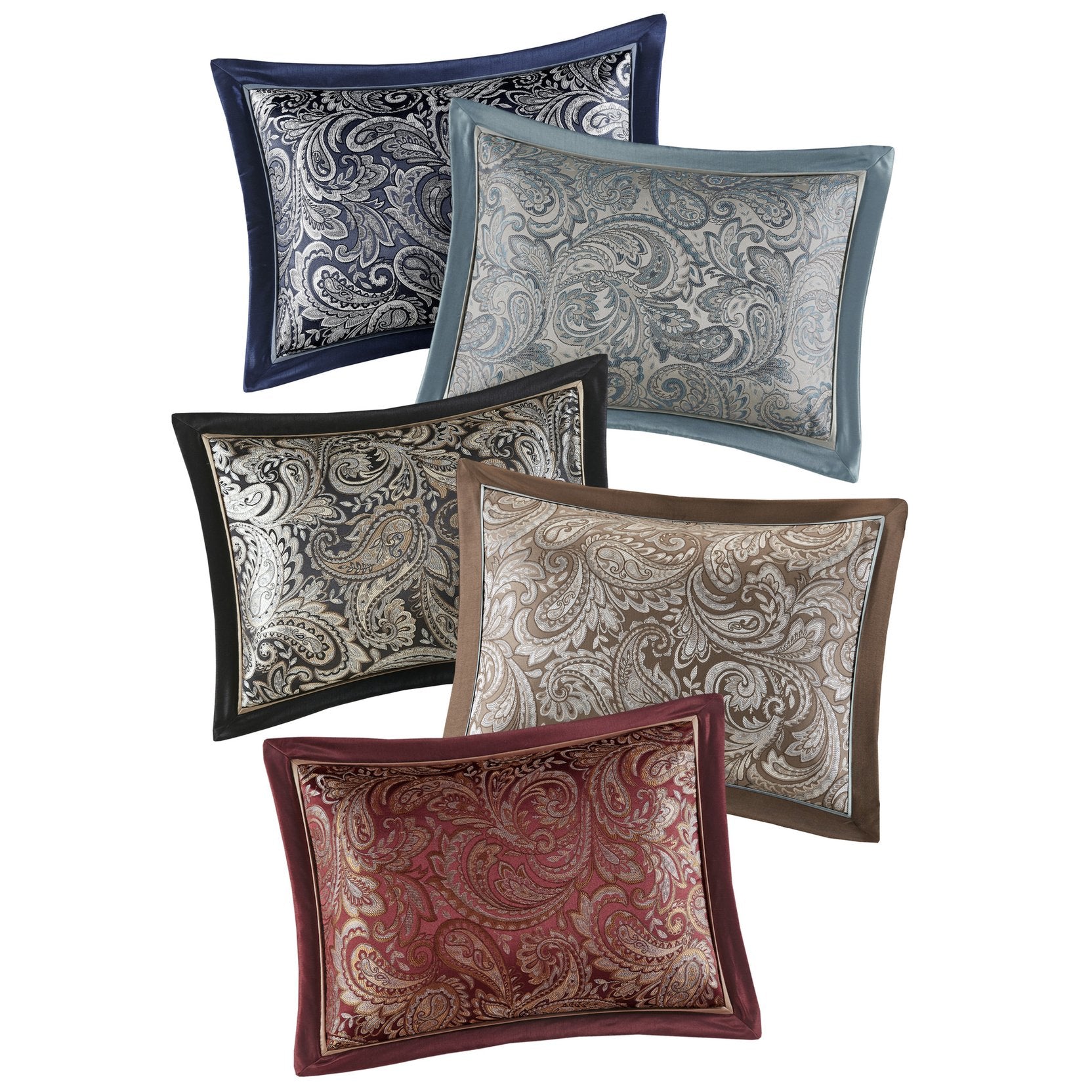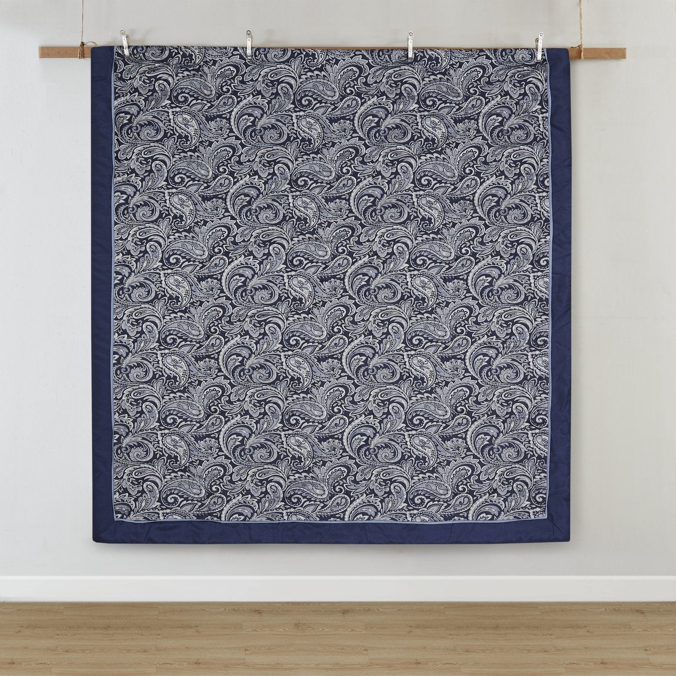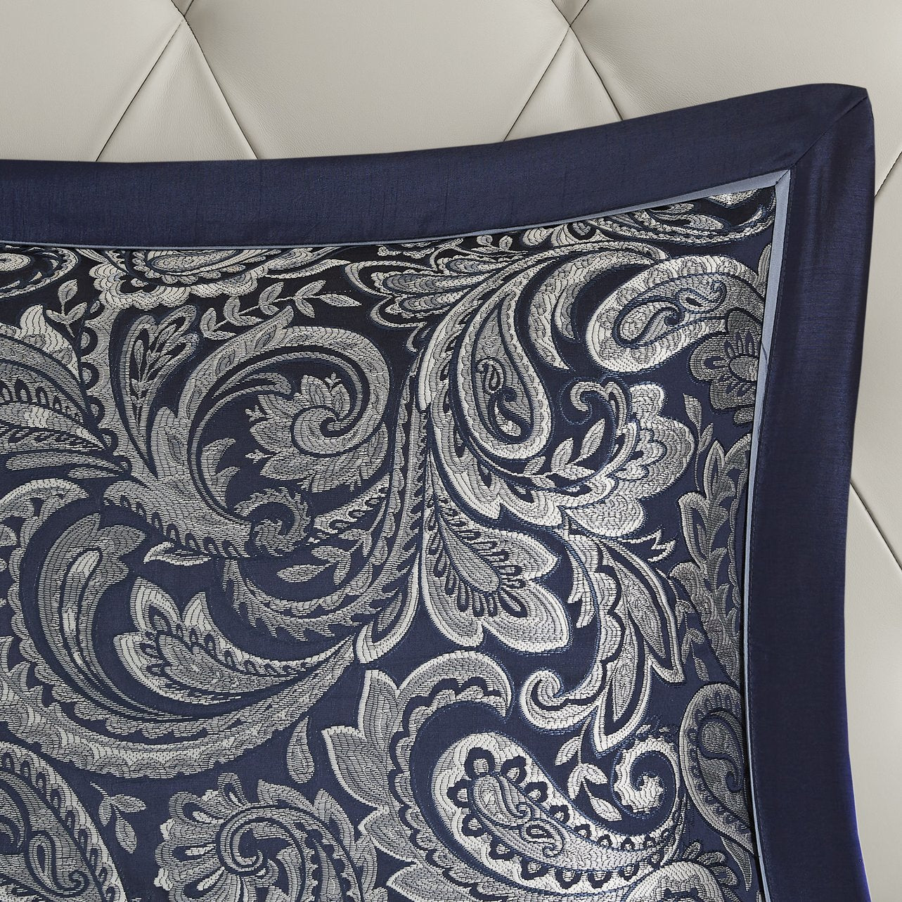 - Design details: Jacquard weave with modern paisley motif; 2" flange and 1/2" flat piping on comforter and shams; reversible comforter (navy pattern / dusty blue reverse).