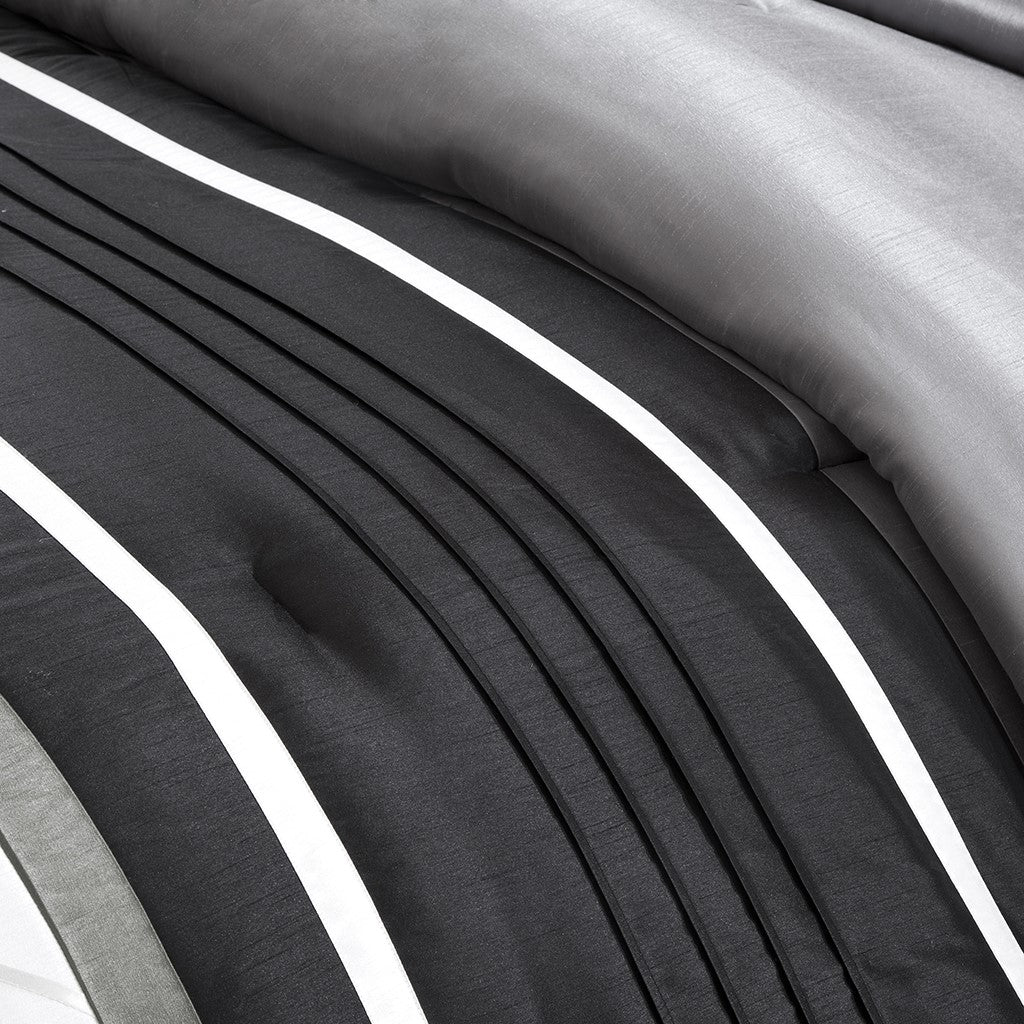 Elevate your bedroom with the Madison Park Blaire 7-piece comforter set, a refined blend of traditional design and modern comfort. Crafted in lustrous faux silk tones of grey, ivory, and black, the set features elegant pintucking and embroidered accents that add depth and texture. Hypoallergenic fill and year-round weight make this ensemble both luxurious and practical, while machine-washable construction simplifies care.