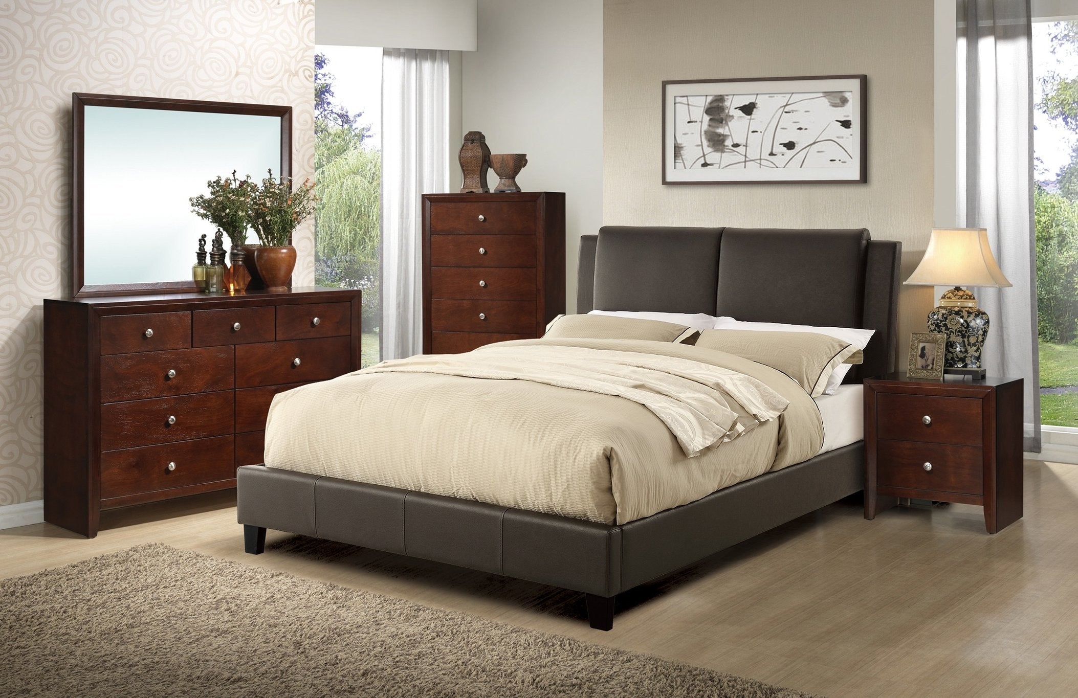 - Included: California King bed frame and headboard only — nightstands, dresser, mirror, and chest not included
