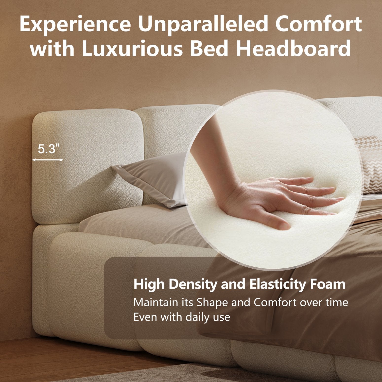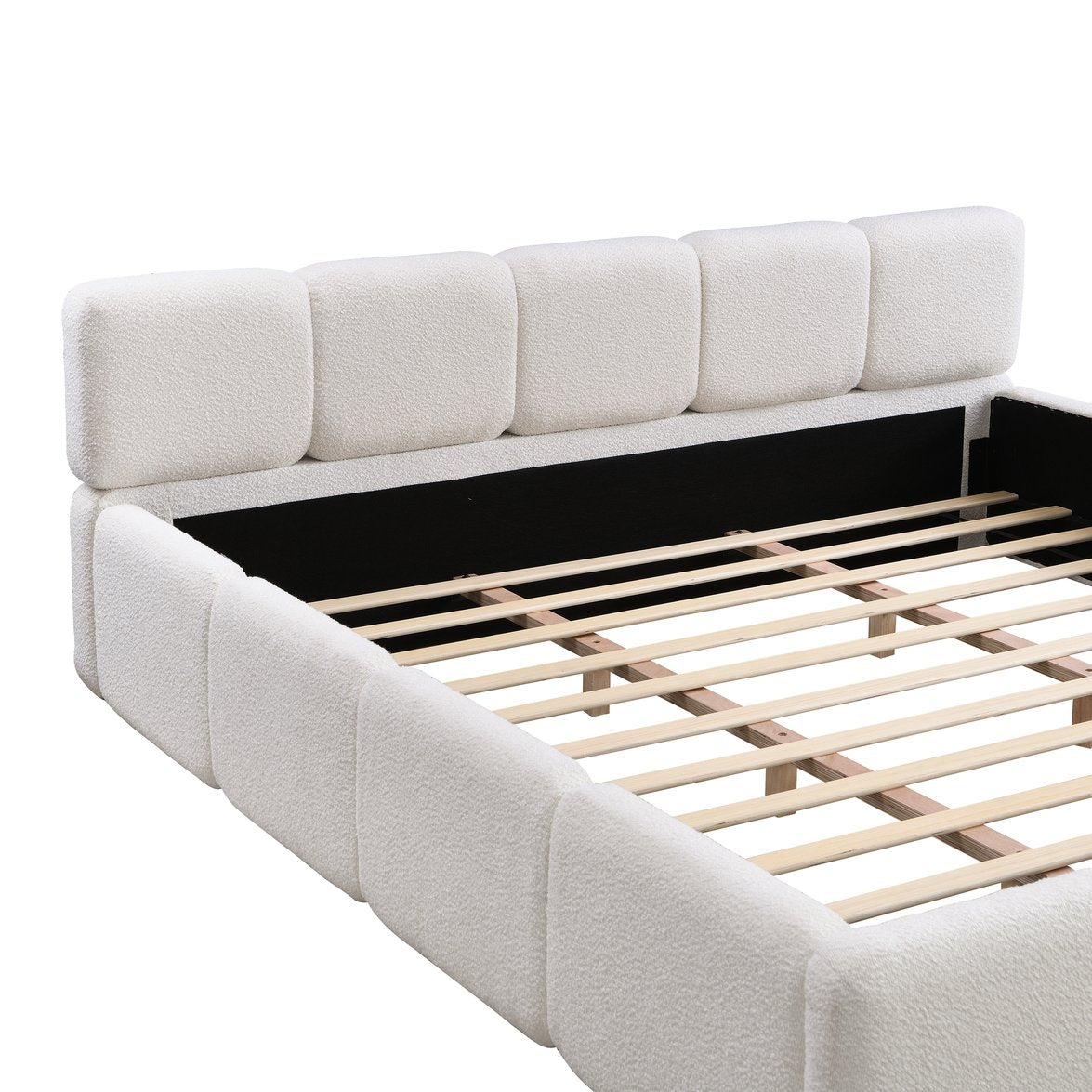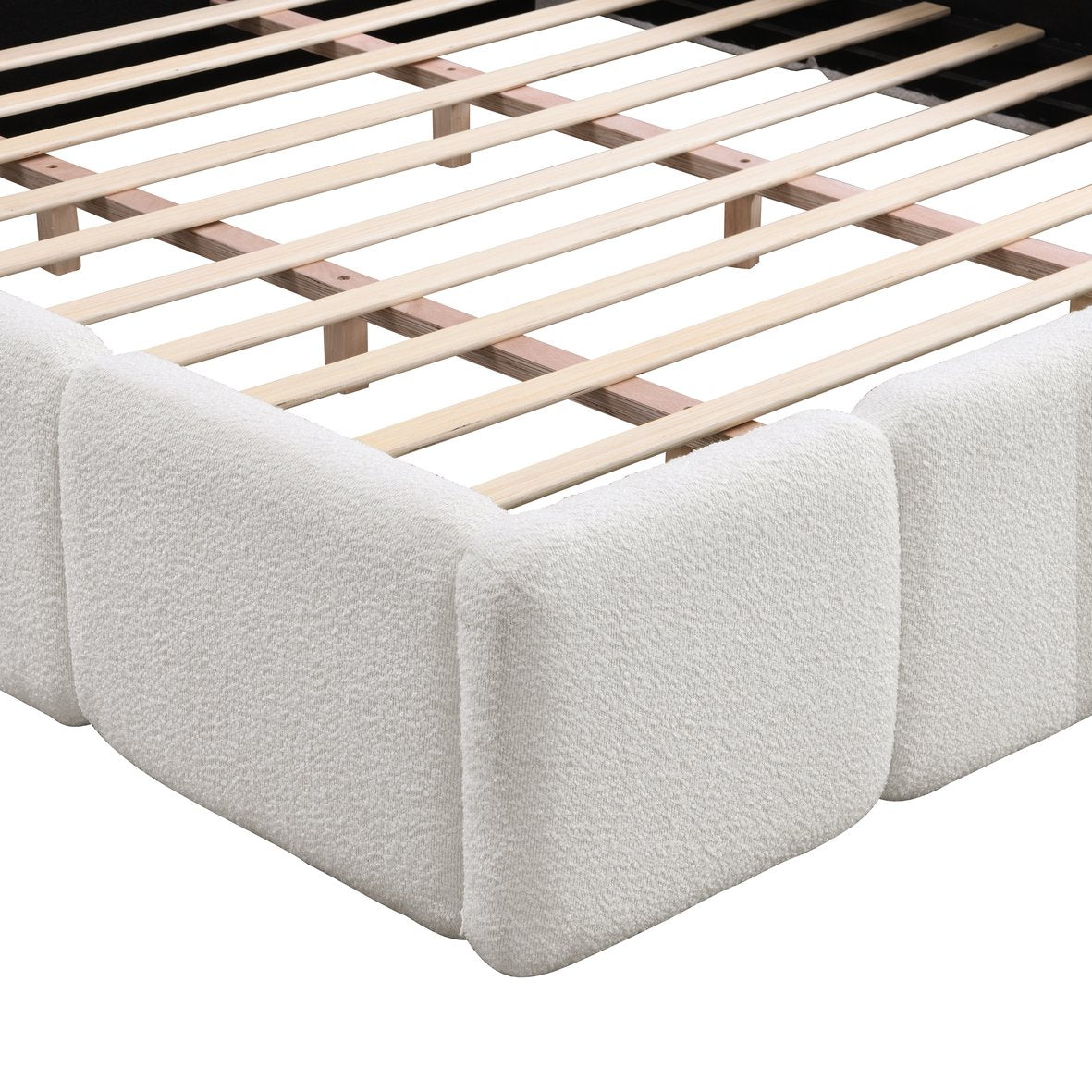 Bring luxury and modern simplicity to your bedroom with this California King platform bed, wrapped in plush boucle upholstery and grounded by a solid block-style frame. Its thick, squared headboard and matching footboard create a cozy, hotel-inspired look while providing lasting support and comfort for everyday use. Designed for easy assembly and versatile styling, this bed blends vintage glamour with contemporary minimalism to become the centerpiece of your sleep space.