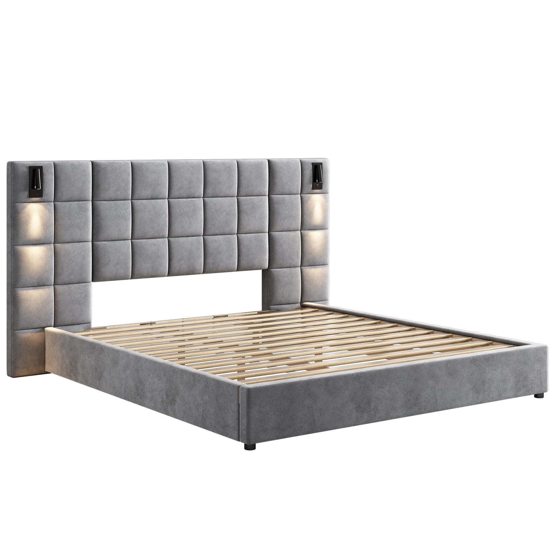 Experience modern luxury and practical design with this California King upholstered bed frame. Crafted for comfort and convenience, its plush velvet upholstery and wide padded headboard create a stylish focal point, while built-in lighting and charging keep essentials within reach—ideal for contemporary bedrooms seeking both form and function.