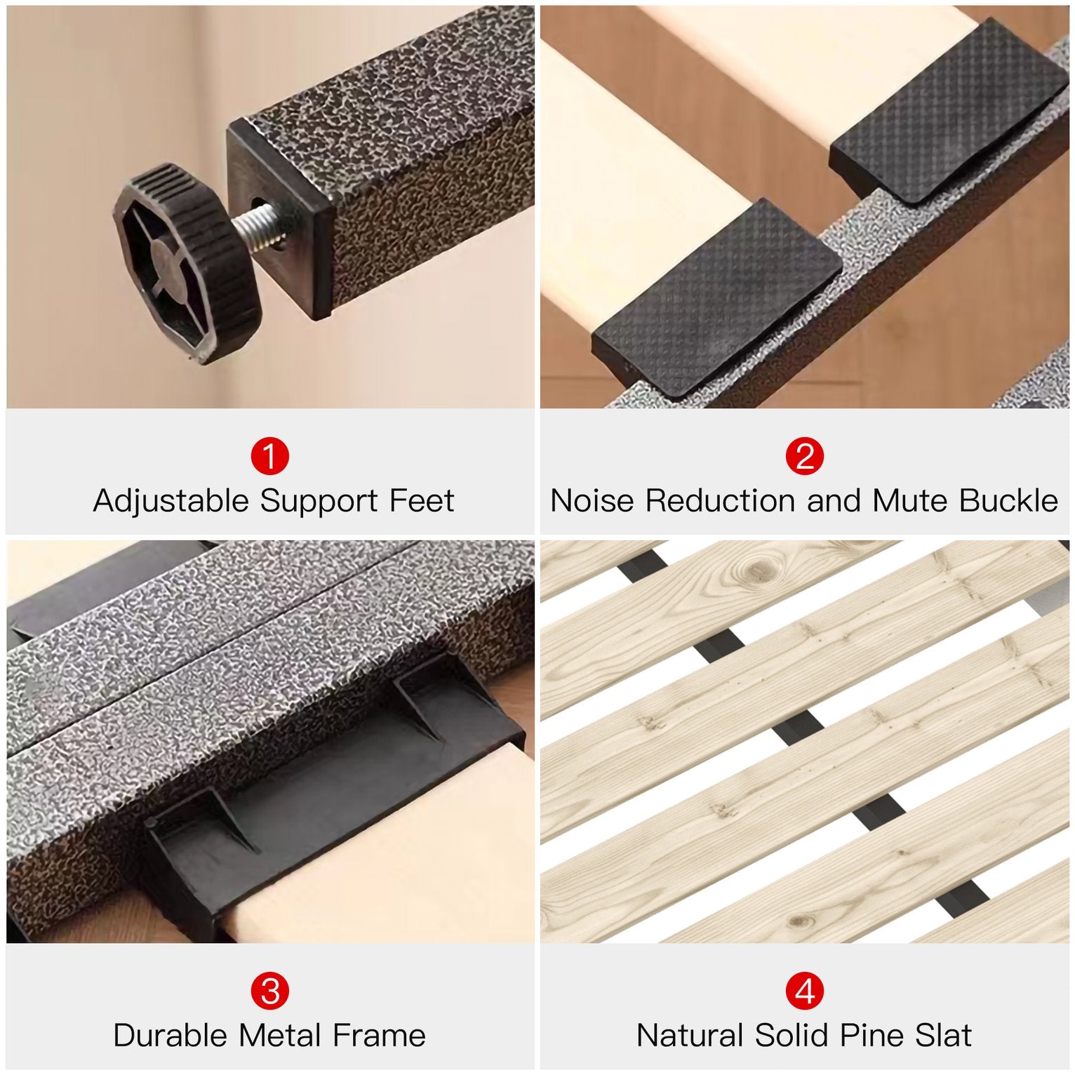 - [Solid & Sturdy]: The frame and slats are made of solid pine wood, which is hard, firm, corrosion resistant, not easy to deform and crack, and has a long service life. The bed slat structure consists of iron frame and solid wood, 24 widened slats, with a width of about 10cm, providing dense and powerful support for the weight of up to 1000 pounds. The metal feet are scientifically designed to withstand pressure and provide sturdy and stable support without deformation.