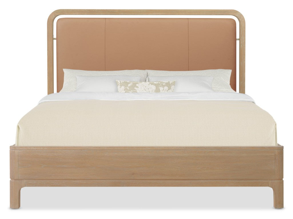 - Materials: White oak solids and oak veneers with top-grain leather upholstery on the headboard
