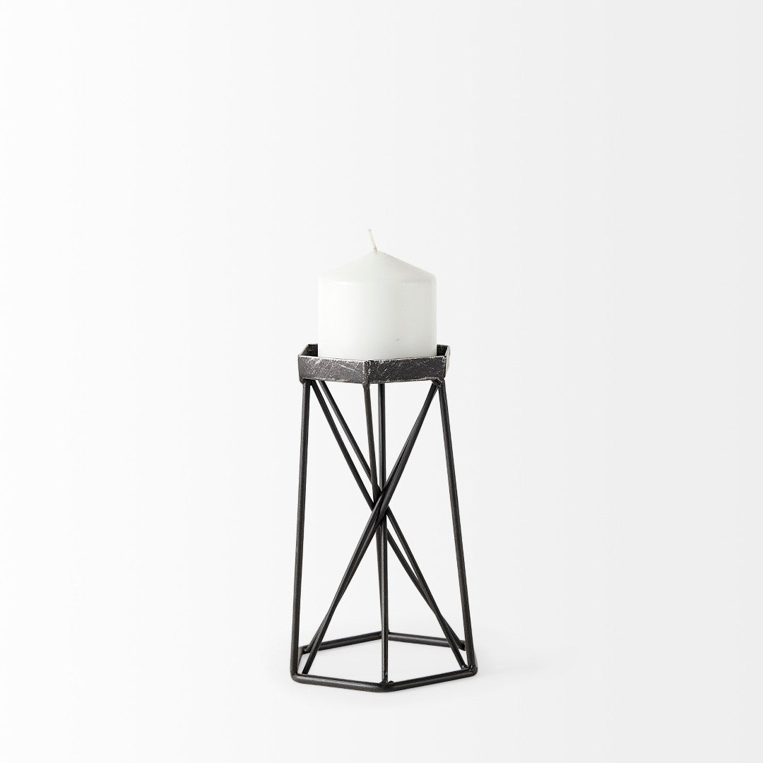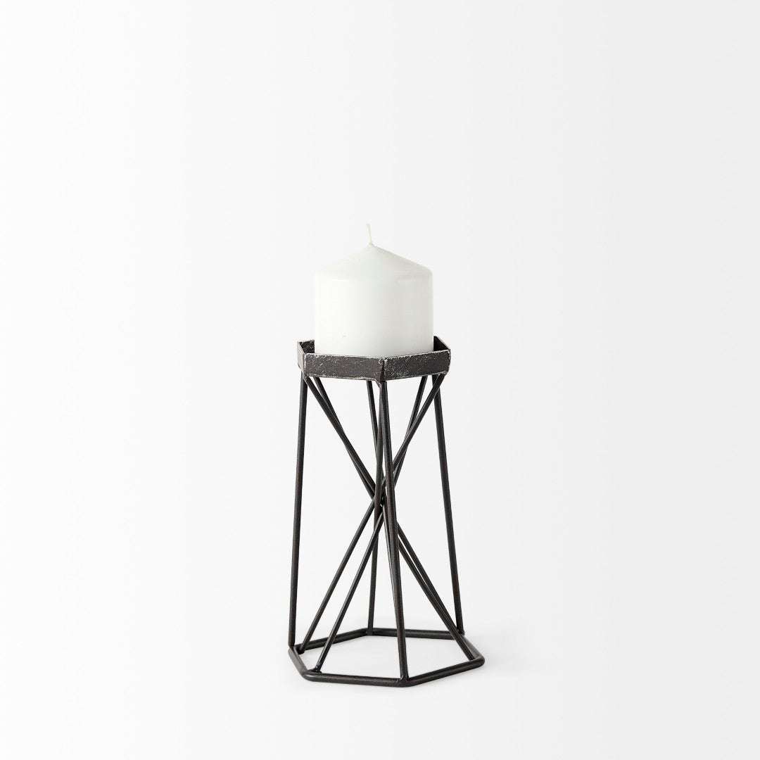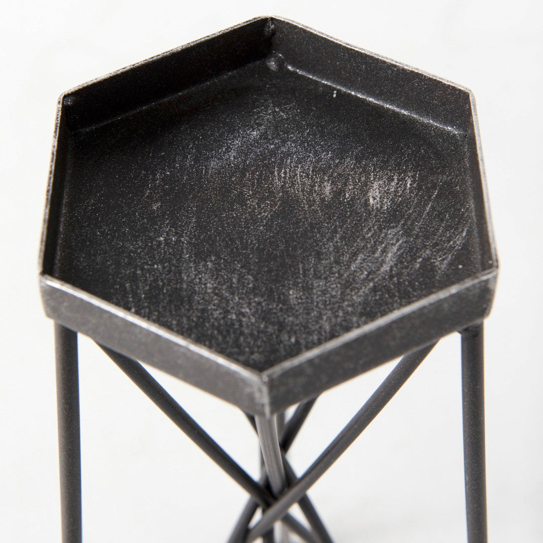 Add a touch of modern-meets-industrial charm with this hexagonal metal candle holder. Its sculptural silhouette and crossed metal rod stand create visual interest whether displayed solo or grouped, while the antiqued finish brings subtle metallic sheen that complements a variety of interiors from Mid‑Century Modern to Urban Loft.