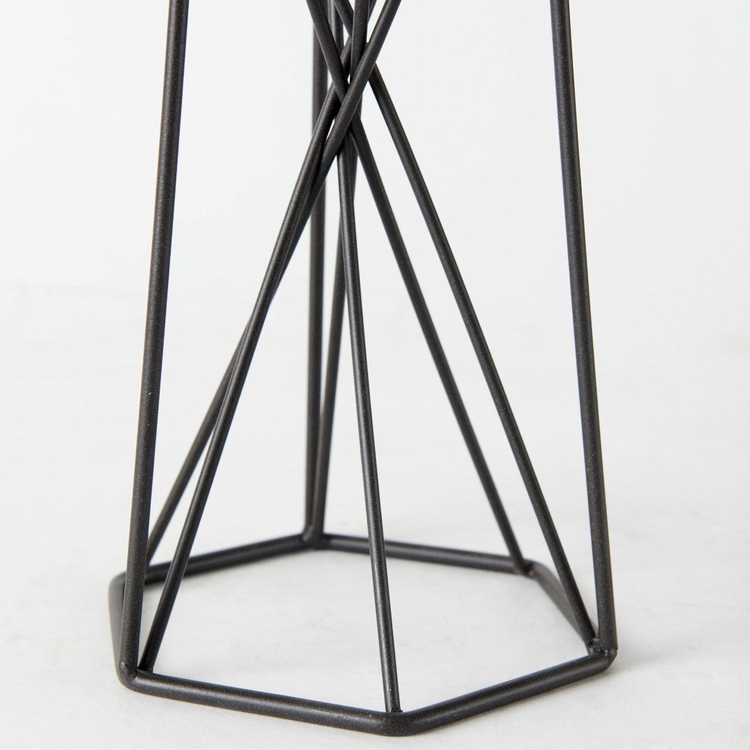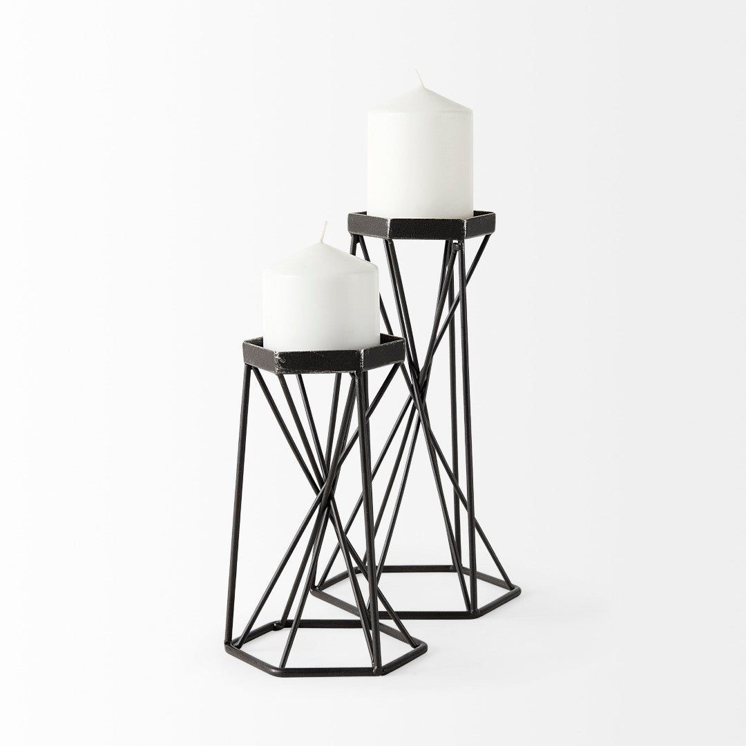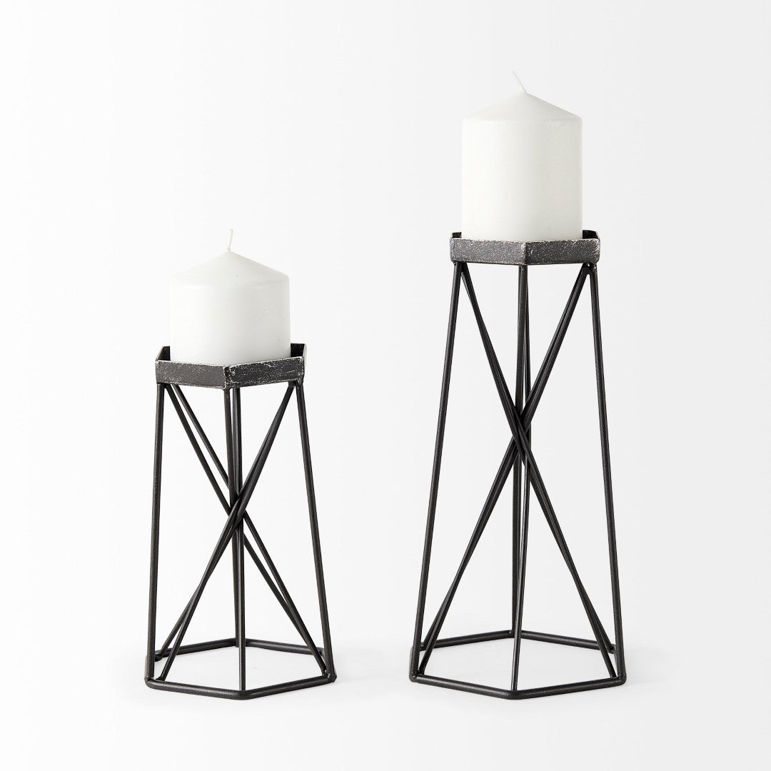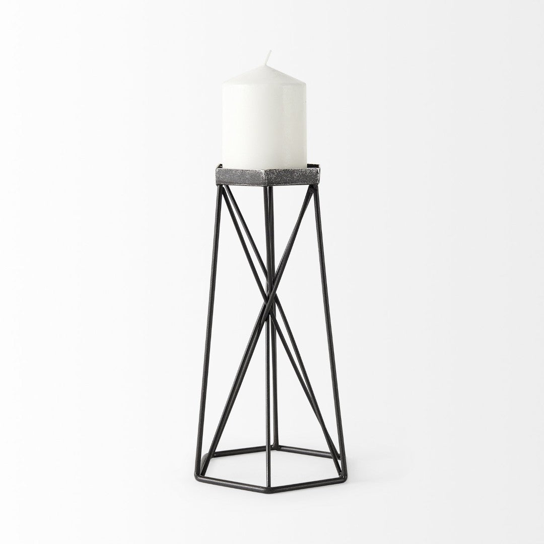 Add a touch of modern-meets-industrial charm with this hexagonal metal candle holder. Its sculptural silhouette and crossed metal rod stand create visual interest whether displayed solo or grouped, while the antiqued finish brings subtle metallic sheen that complements a variety of interiors from Mid‑Century Modern to Urban Loft.