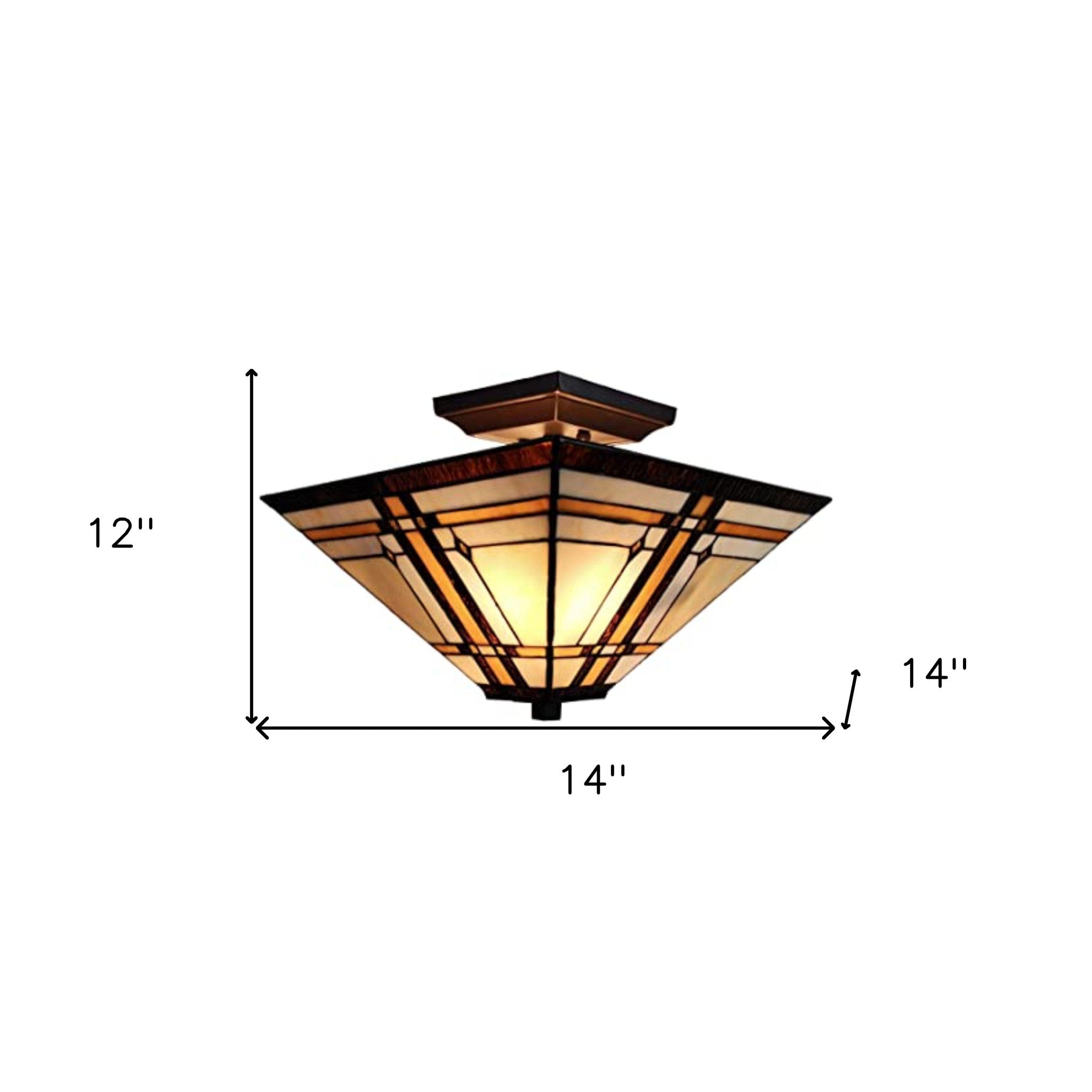 - Dark Yellow and Brown Stained Glass Mission Shape Semi Flush Hanging Light.