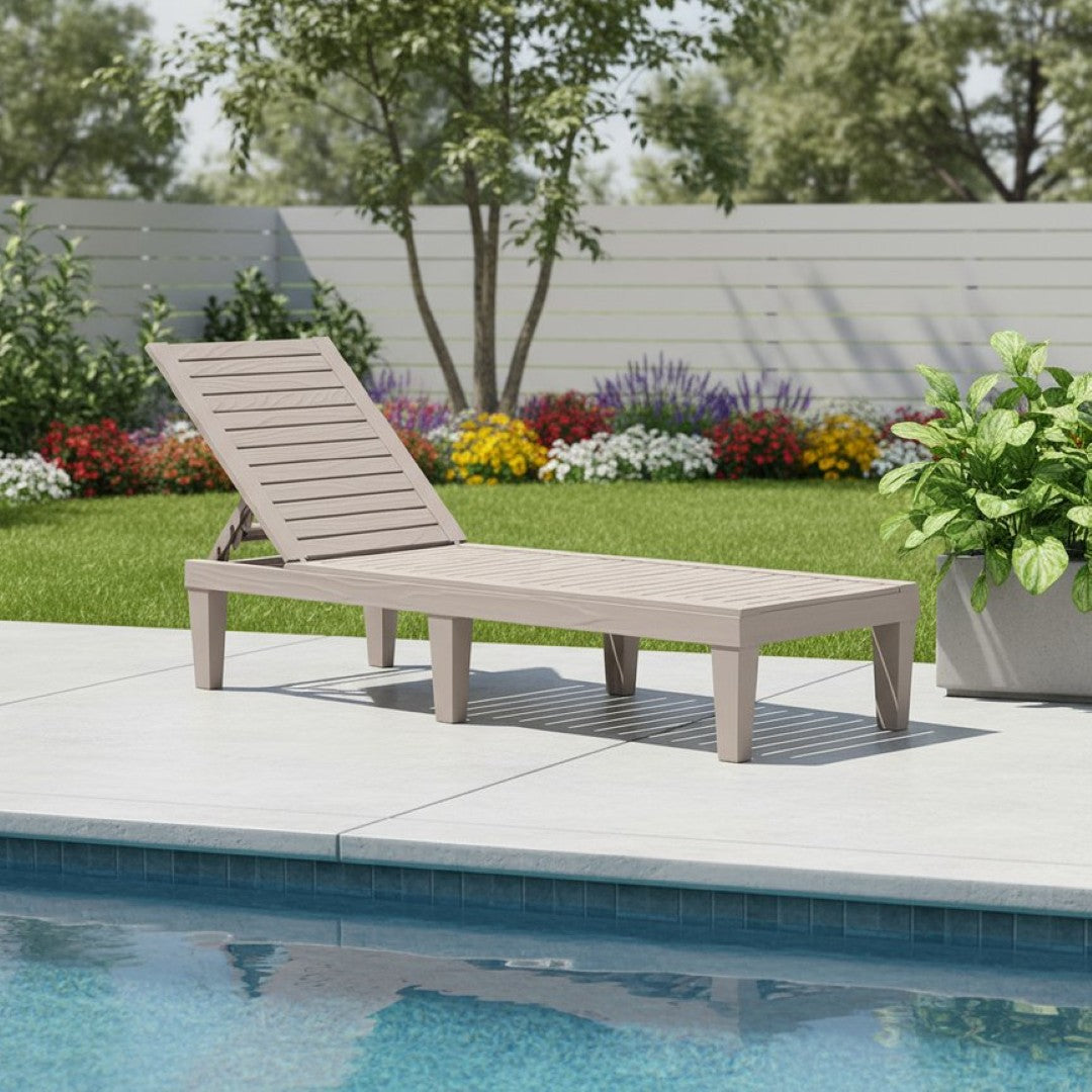 Sink into ultimate outdoor comfort with this modern, resort-style chaise lounge designed for durability and everyday relaxation. Its faux wood-grain finish and streamlined armless profile deliver a contemporary look that complements patios, pool decks, and garden retreats while the five-position adjustable backrest lets you find the perfect angle for lounging, reading, or sunbathing.