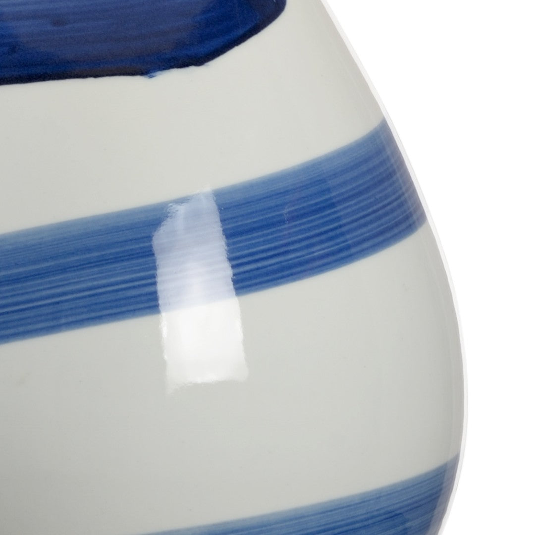 - Finish: White glazed porcelain body with hand-painted blue swirl brushstroke