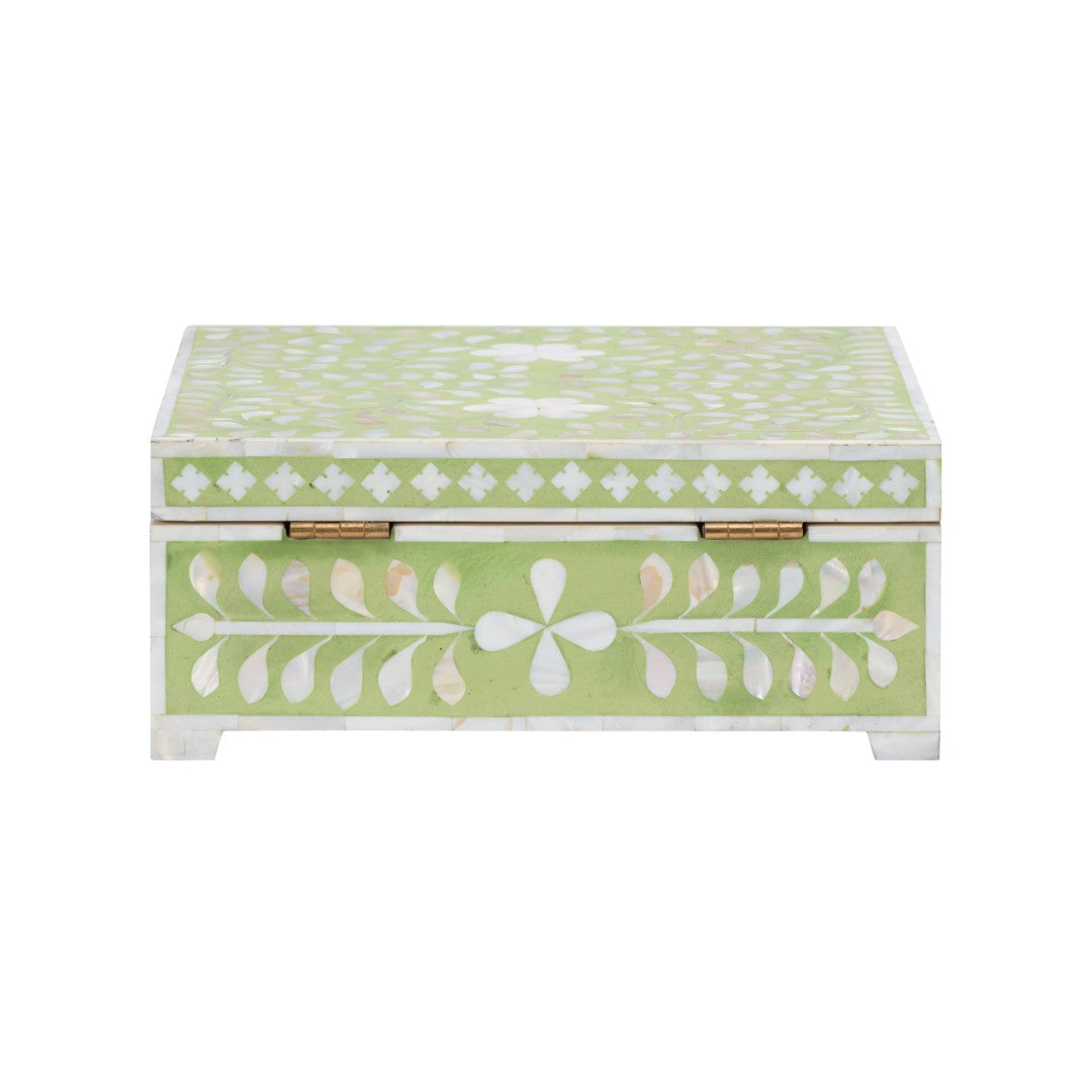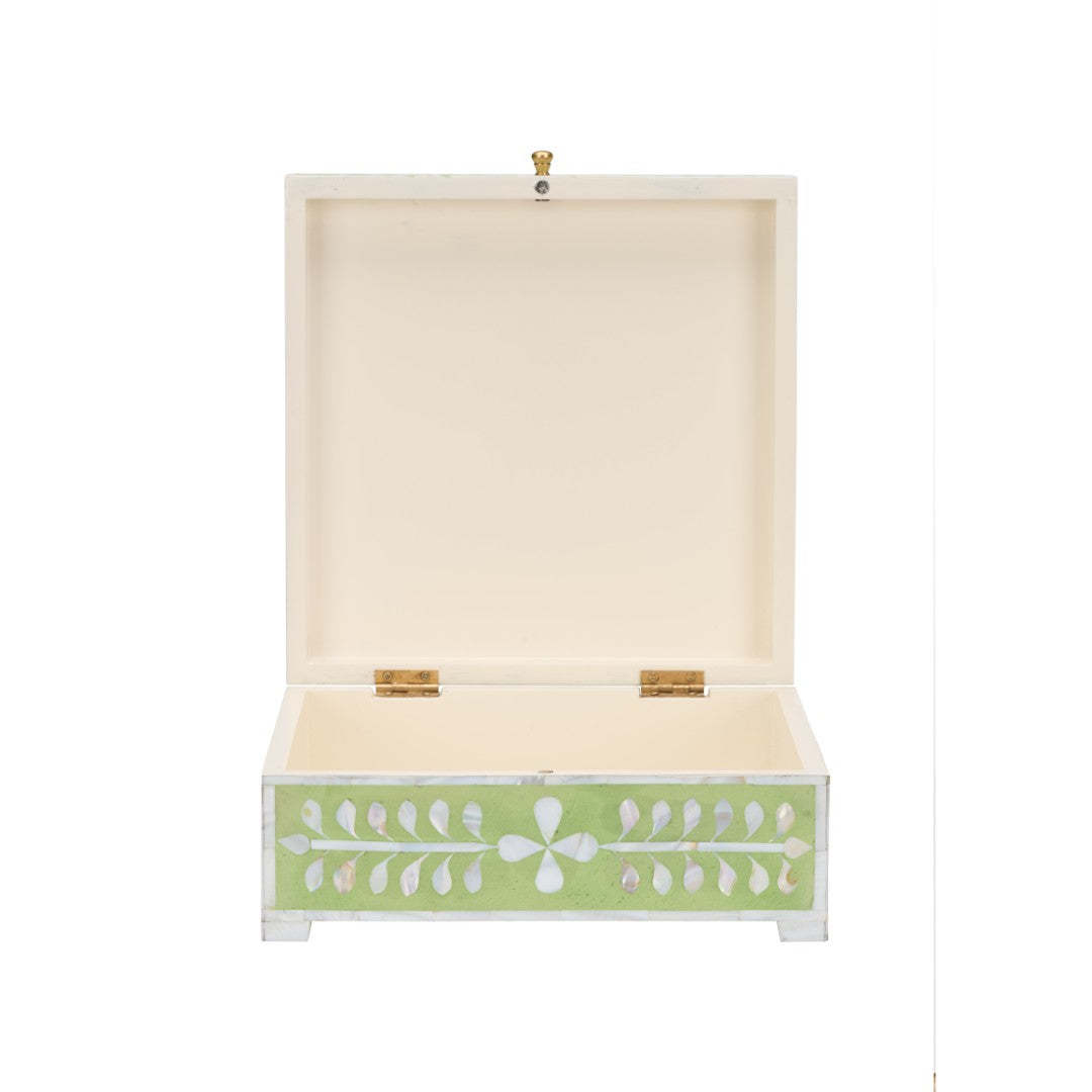 Add a touch of artisanal elegance to any room with this handcrafted green bone inlay box. Its refined white motif and smooth hinged lid make it both a decorative centerpiece and a practical storage solution for jewelry, keepsakes, or desk items.