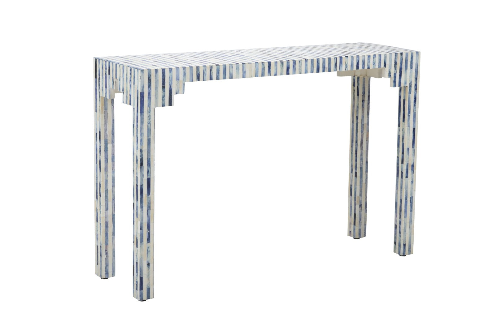 Elevate your entryway or living space with this elegant bone inlay console. Hand-cut bone pieces are meticulously arranged to form a striking blue-and-cream pattern, creating a refined focal point that blends artisanal detail with a slim, modern silhouette. Ideal for narrow hallways, behind sofas, or as an accent table, this console delivers beauty and function without overwhelming your space.