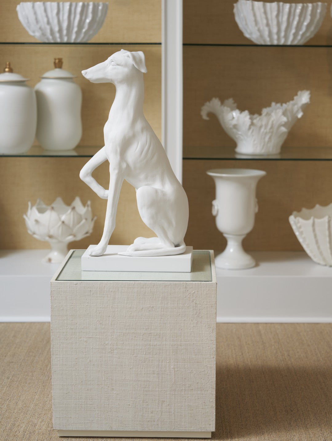 - Linen-wrapped body with a smooth white lacquer finish for a subtle textured look