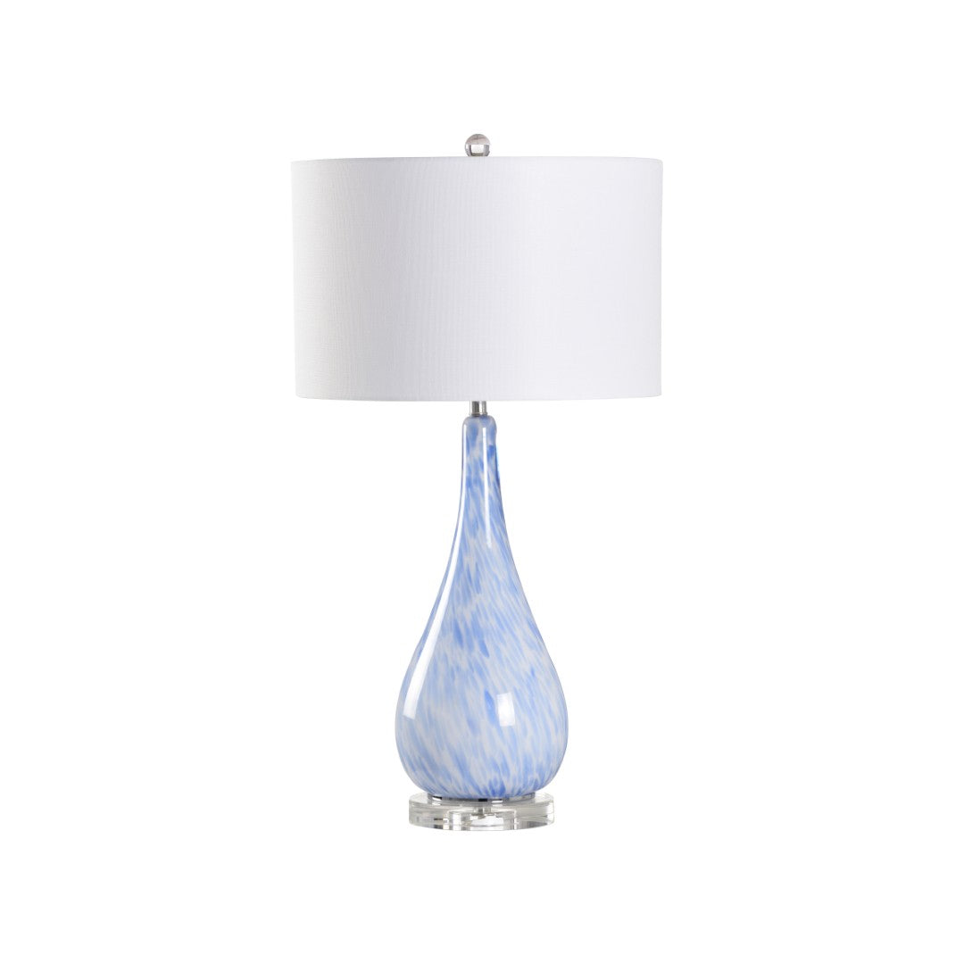 - Design: Hand-blown opaque white and light blue glass body with a clear acrylic base for a light, airy appearance.