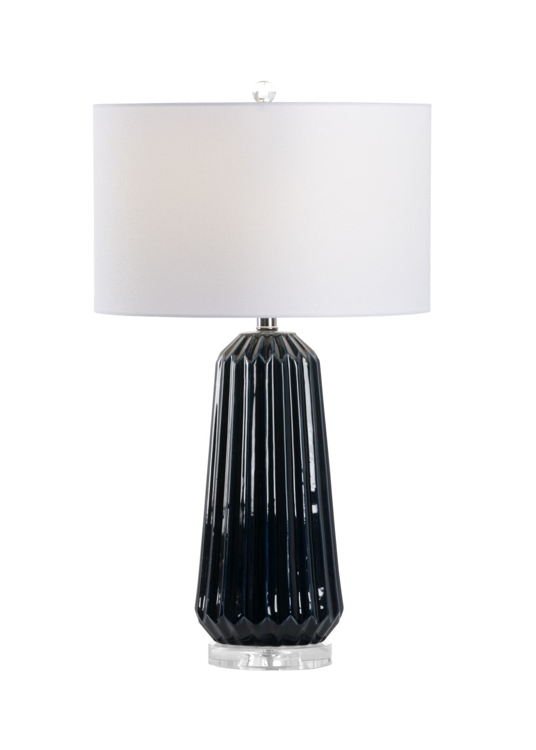 A refined table lamp that blends classic form with contemporary materials, the Gamble Lamp in midnight blue adds a touch of sophistication to living rooms, bedrooms, or offices. Its fine ribbed ceramic body and clear crystal base are accented with polished nickel hardware for an elevated, luminous look that works equally well in modern and transitional interiors.