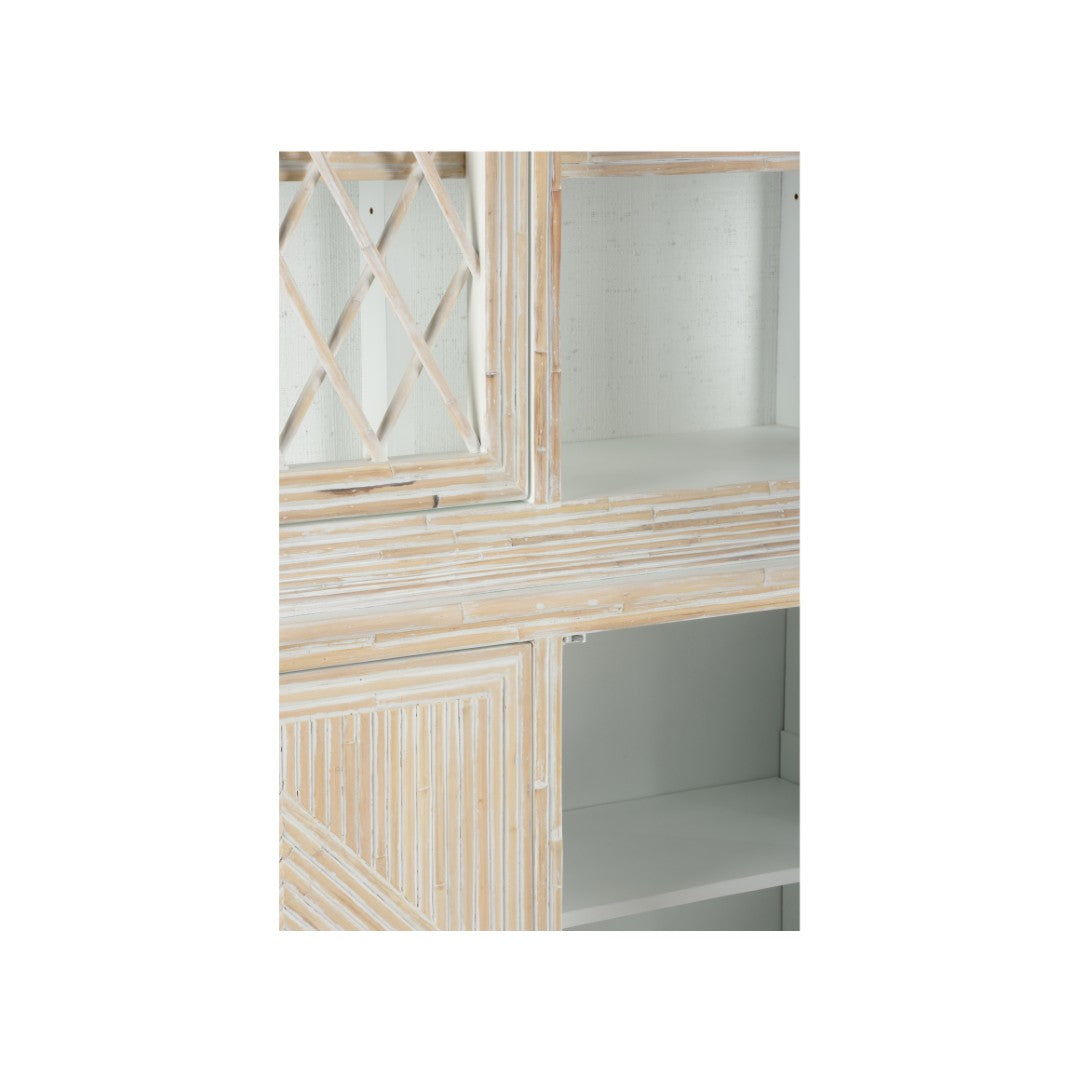 Refresh your living space with the Lyford Cay Breakfront — a modern, airy interpretation of a classic breakfront silhouette. Whitewashed bamboo and a painted white interior with delicate Chinoiserie details create a light, elegant focal point while open fretwork adds texture and visual interest. Designed by Jamie Merida, this piece balances decorative appeal with practical storage and display options.