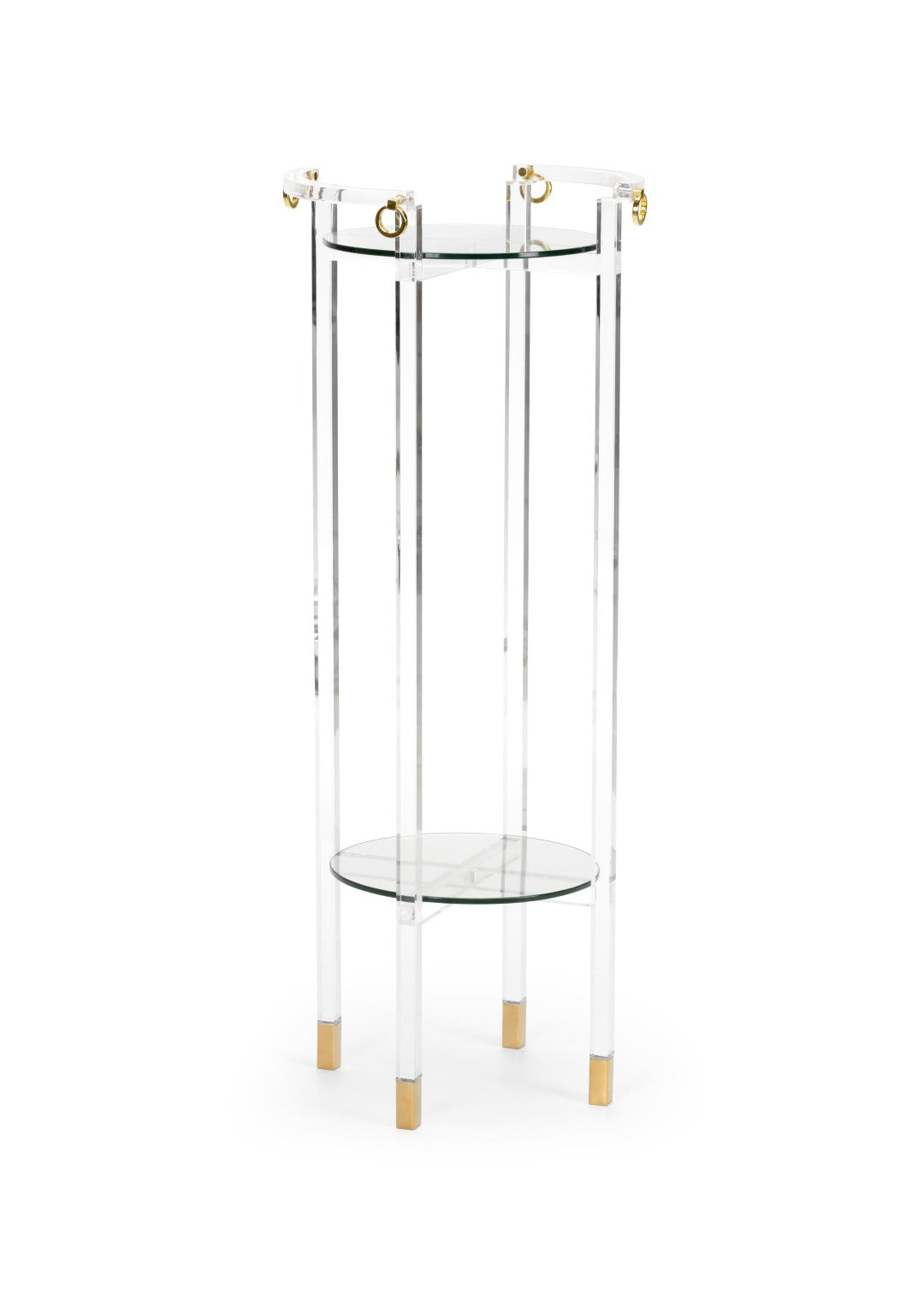 Elevate any room with this elegant acrylic pedestal designed by Claire Bell. Its clear acrylic construction and tempered glass shelves create a light, airy display that highlights art, sculptures, and decorative objects, while polished brass rings add a refined, contemporary touch. Ideal for galleries, living rooms, or entryways, this pedestal combines durability with sophisticated style.