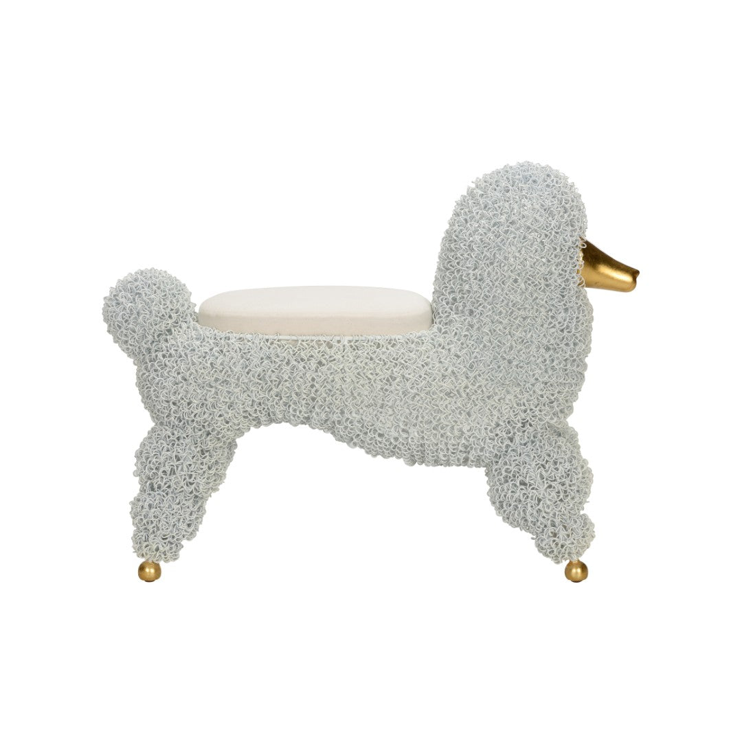 Add a playful, sculptural accent to your home with this whimsical poodle-shaped stool. Compact yet sturdy, it works beautifully as a footrest, a small extra seat, or a decorative focal point in a bedroom, nursery, or living area. The curled white wire frame creates a light, airy silhouette while the cream muslin-upholstered seat provides comfortable support; brushed gold accents on the nose and feet complete the charming look.