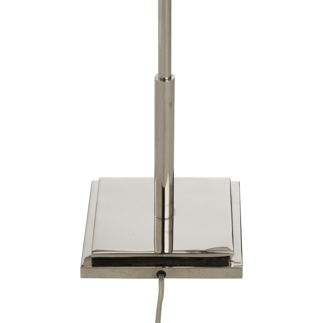 This refined floor lamp combines modern geometry with architectural presence, offering a sculptural accent that elevates both contemporary and classic interiors. Crafted in polished nickel and designed by Jamie Merida, it balances bold form with subtle sophistication to serve as a standout statement light or a complementary piece in living rooms, entryways, or offices.