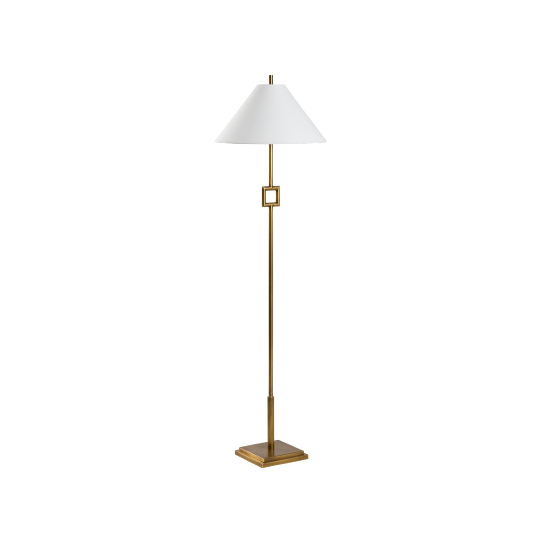 Elevate your living space with a sculptural floor lamp that blends modern minimalism and architectural detail. The warm aged brass finish and bold square accent create a refined focal point, while the slender metal profile provides functional lighting without overwhelming your room. Designed by Jamie Merida, this lamp works equally well in contemporary, transitional, or classic interiors.
