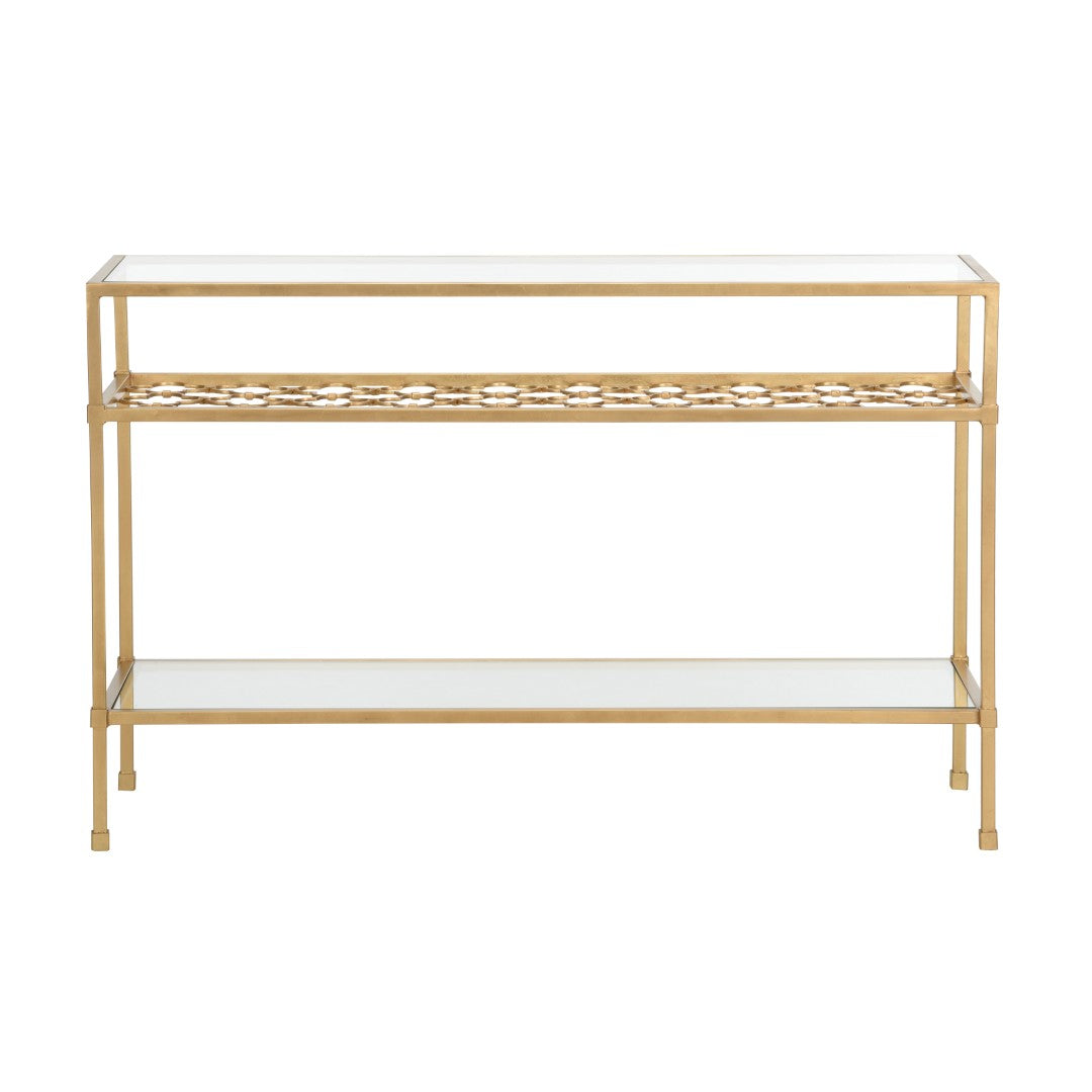 Elevate your entryway or living area with this elegant, narrow console table that blends vintage charm and modern minimalism. The antique gold iron frame and clear glass shelves create an airy, upscale look while providing practical display and storage space for decor, lighting, and everyday essentials. Designed by Bill Cain, it suits hallways, behind sofas, or as a refined focal point in smaller rooms.