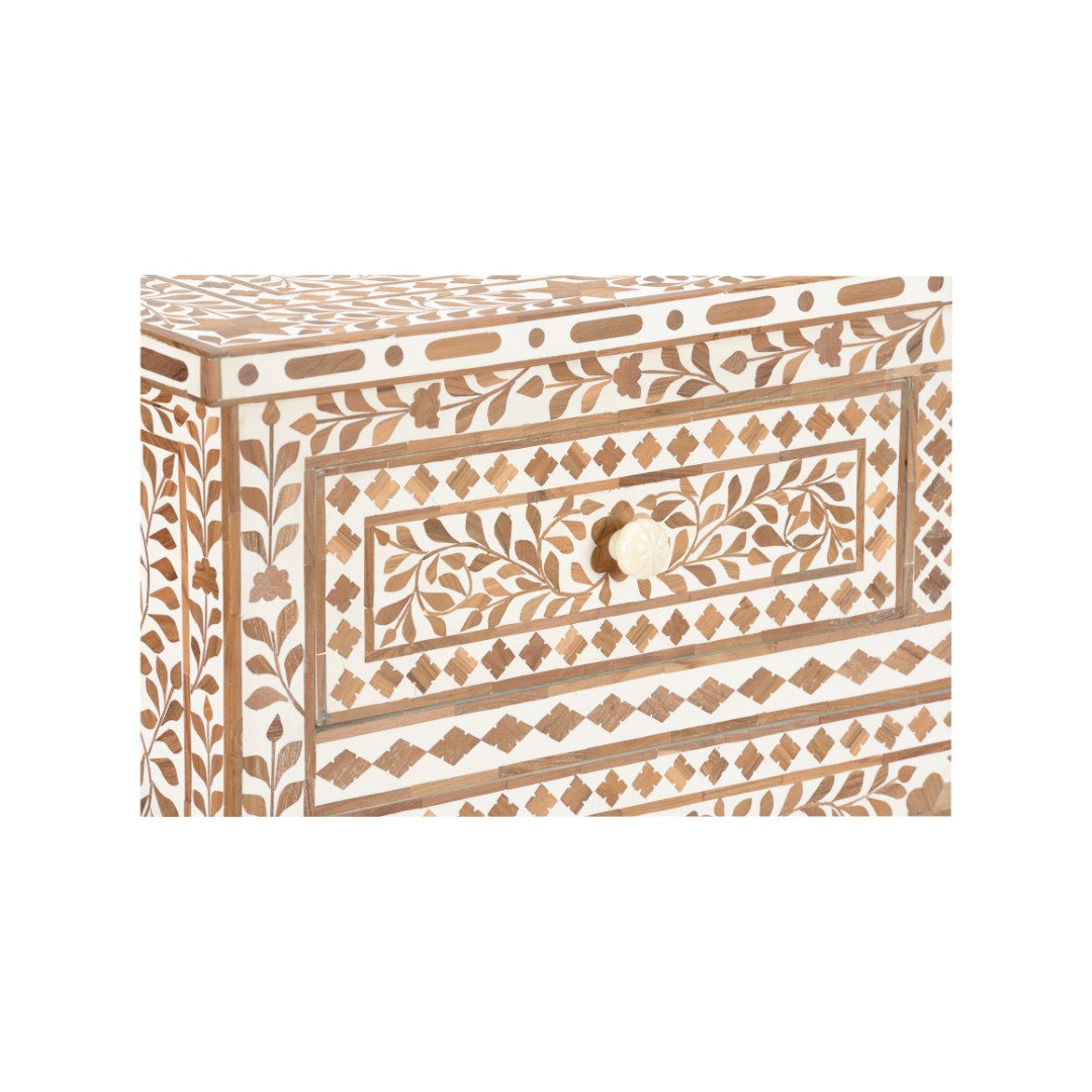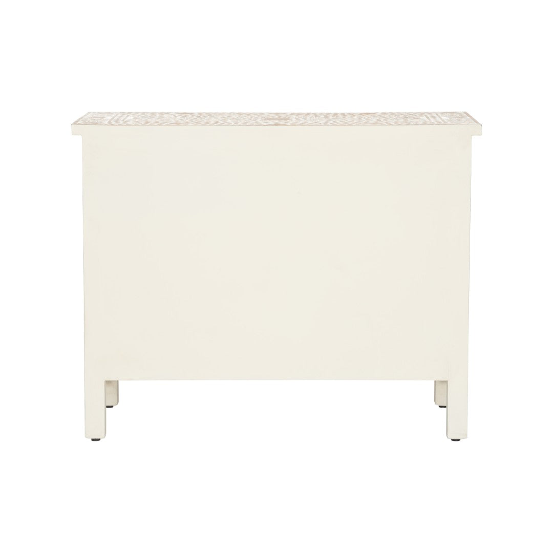 Elevate your space with the Zara Chest — an artful storage solution that pairs handcrafted teak inlay with delicate white detailing. Its intricate floral motif and warm wood tones create a striking focal point that complements both contemporary and traditional interiors while providing practical storage and display options.