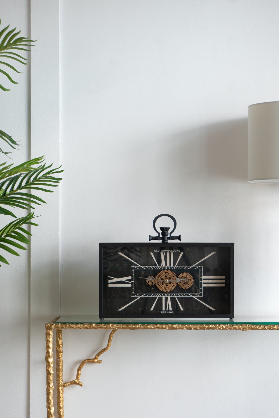- This table clock draws inspiration from old-town London decor, boasting a black rectangular silhouette, white Roman numerals, and a cluster of golden gears that operate silently within a glass casing.