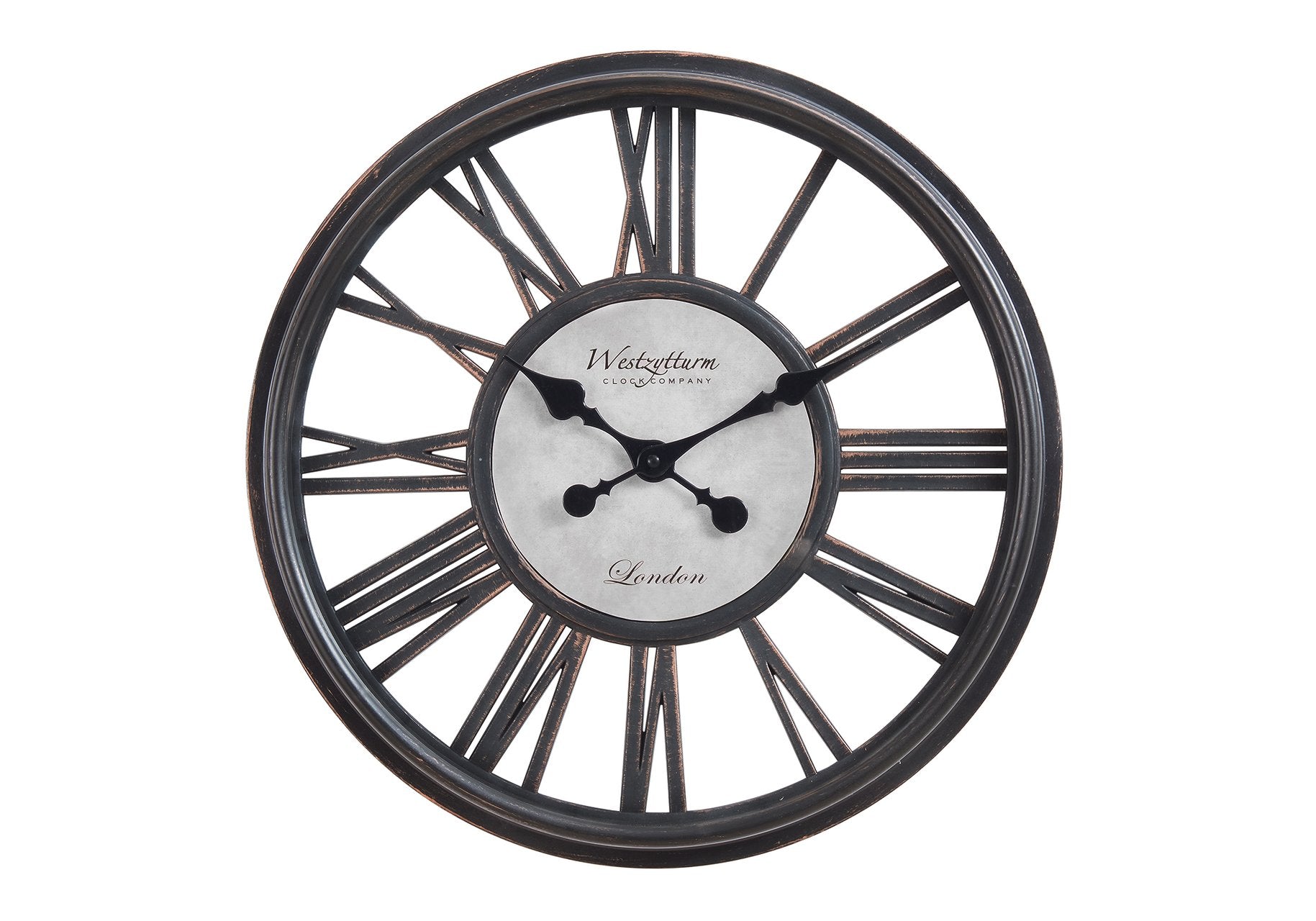 Add timeless style to your space with this 18" round wall clock that blends transitional and vintage-inspired design. Its open, skeleton-style face and Roman numerals offer clear readability while the antique black finish and stamped vintage backdrop create a decorative focal point suitable for living rooms, entryways, bedrooms, or offices.