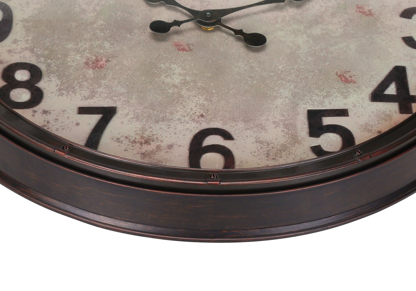 - The easy to read analog clock features bold numerical markings on a parchment style paper background under a clear glass surface.