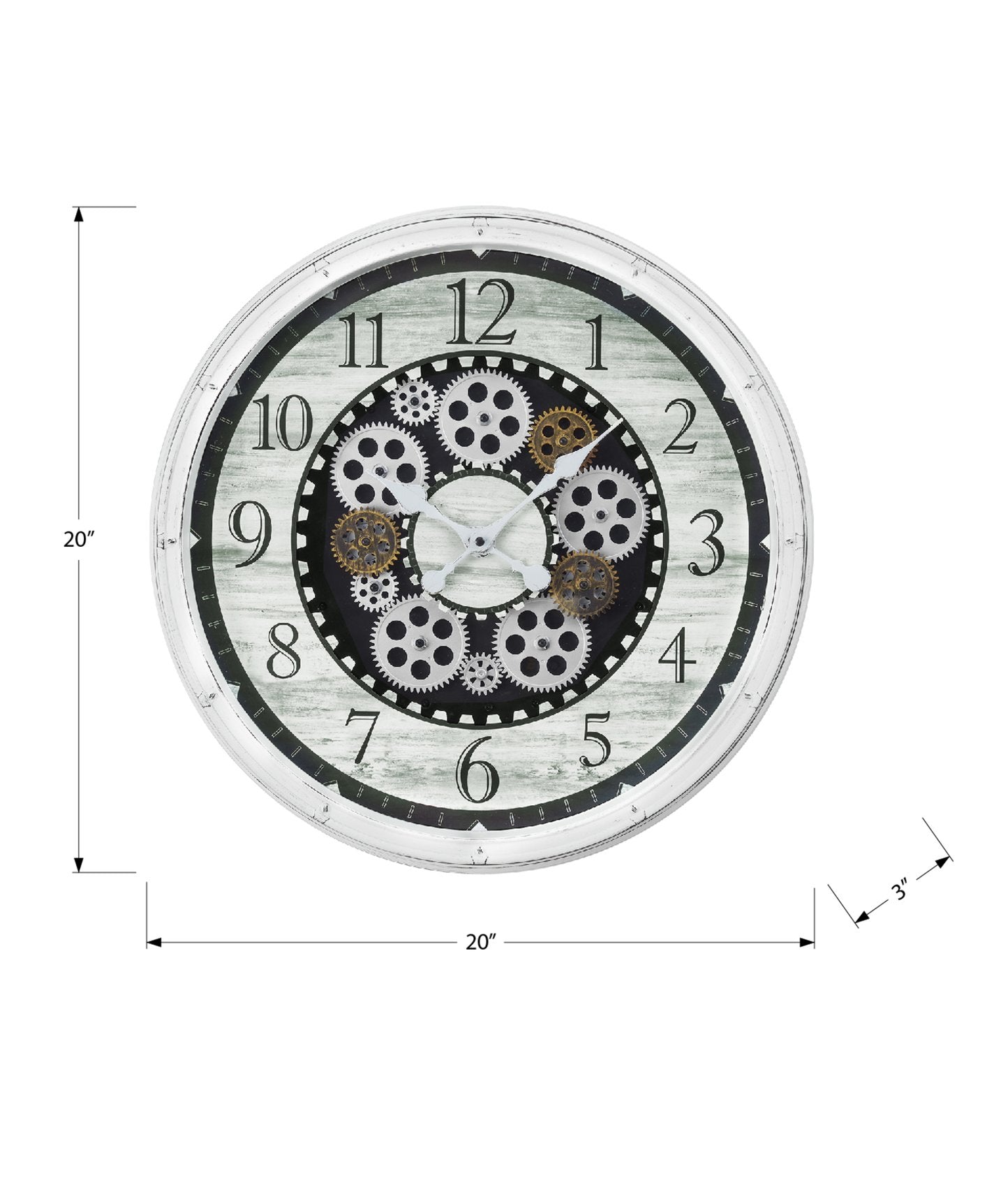 - A trendy and chic 20" round wall clock with unique white and bronze moving gear mechanism at its center for a sophisticated look.