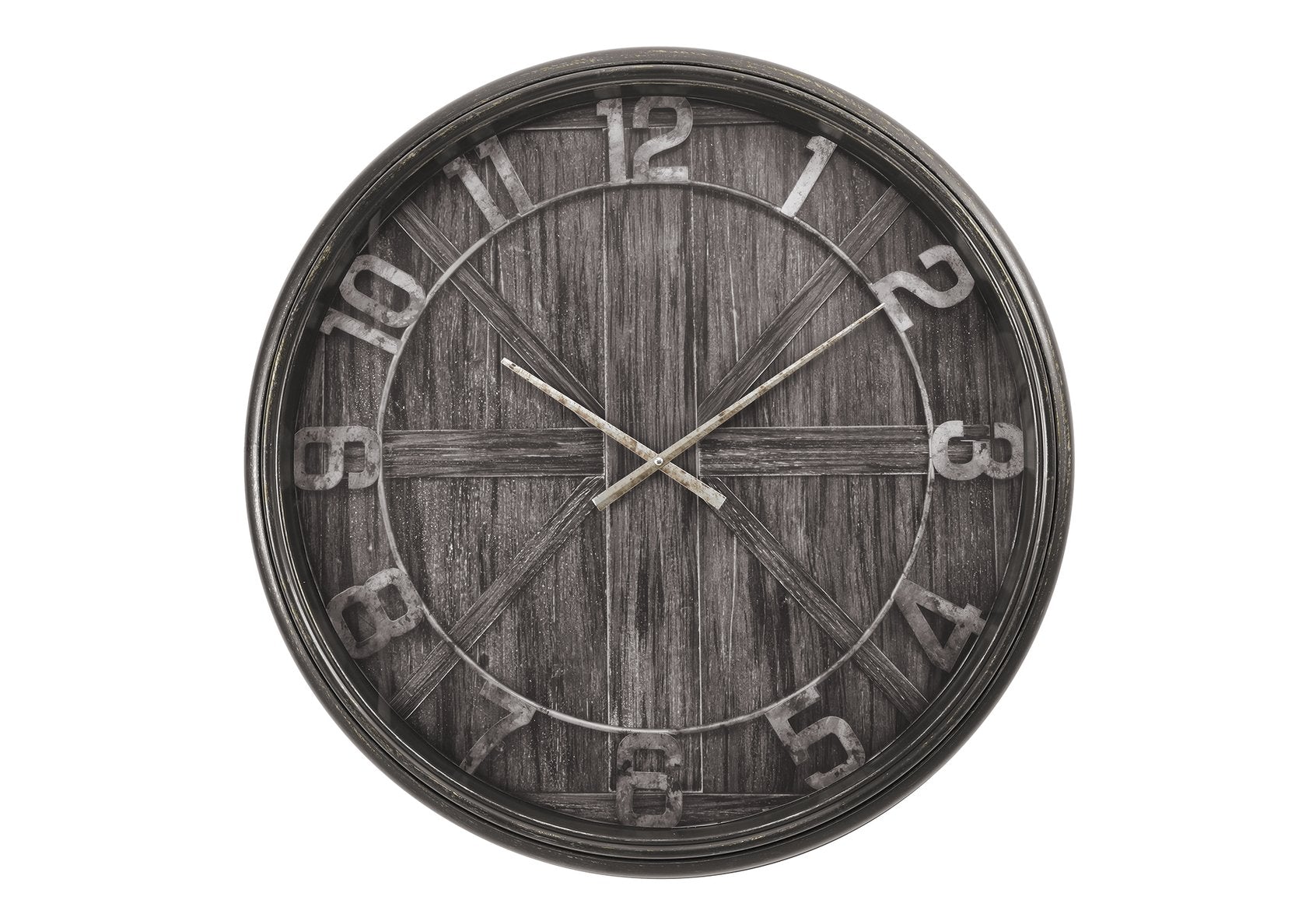 Add a bold focal point to your room with this oversized 30" round wall clock that blends classic charm with modern function. The lightly distressed brown frame and printed wood-look backdrop create a warm, transitional aesthetic while the protective glass face and large, easy-to-read numerals make it practical for everyday use. Ideal for living rooms, entryways, kitchens, or office spaces where a statement timepiece is desired.