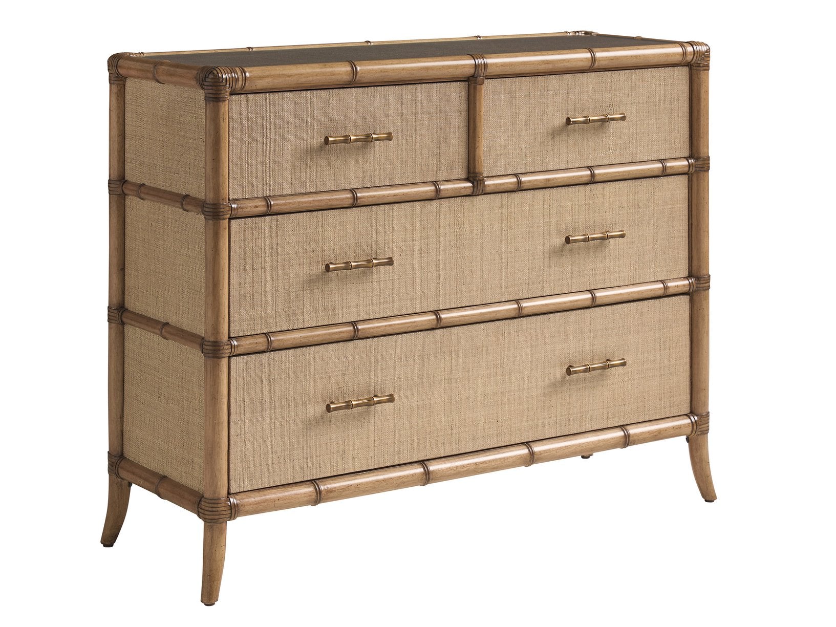 - Clad in woven raffia, enhancing texture and visual appeal on the drawer fronts and side panels.