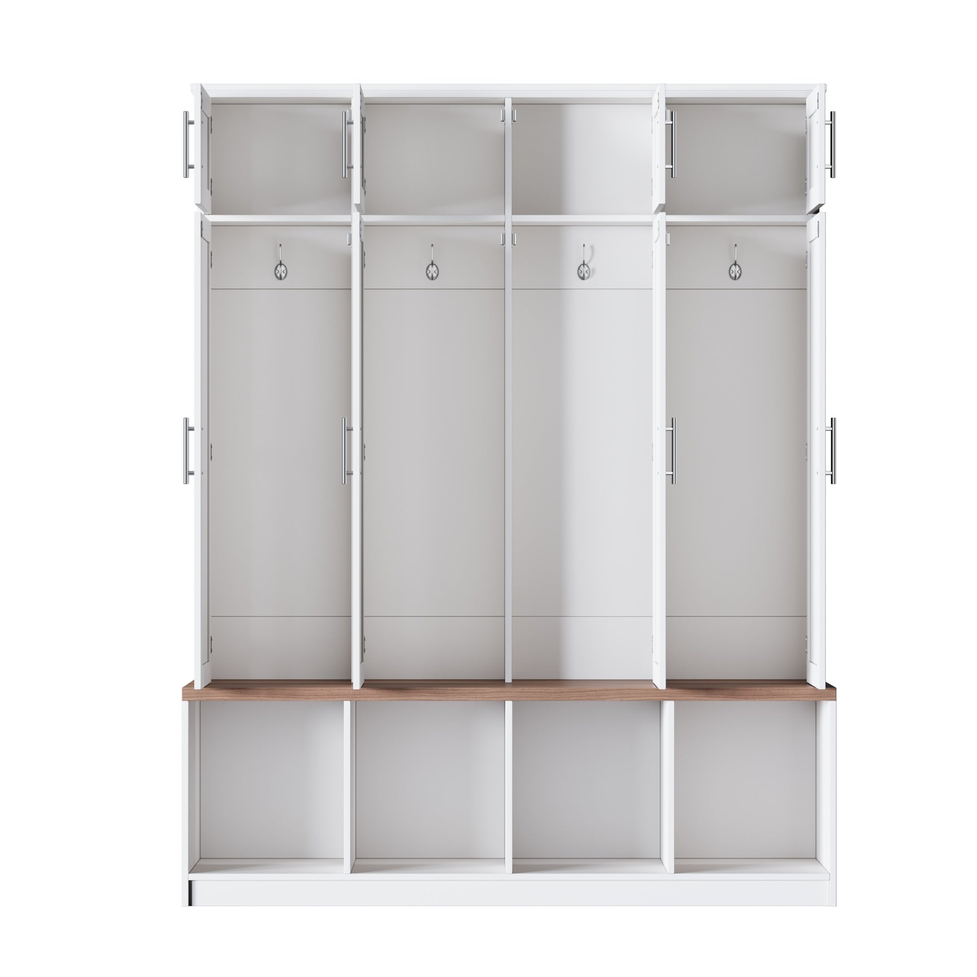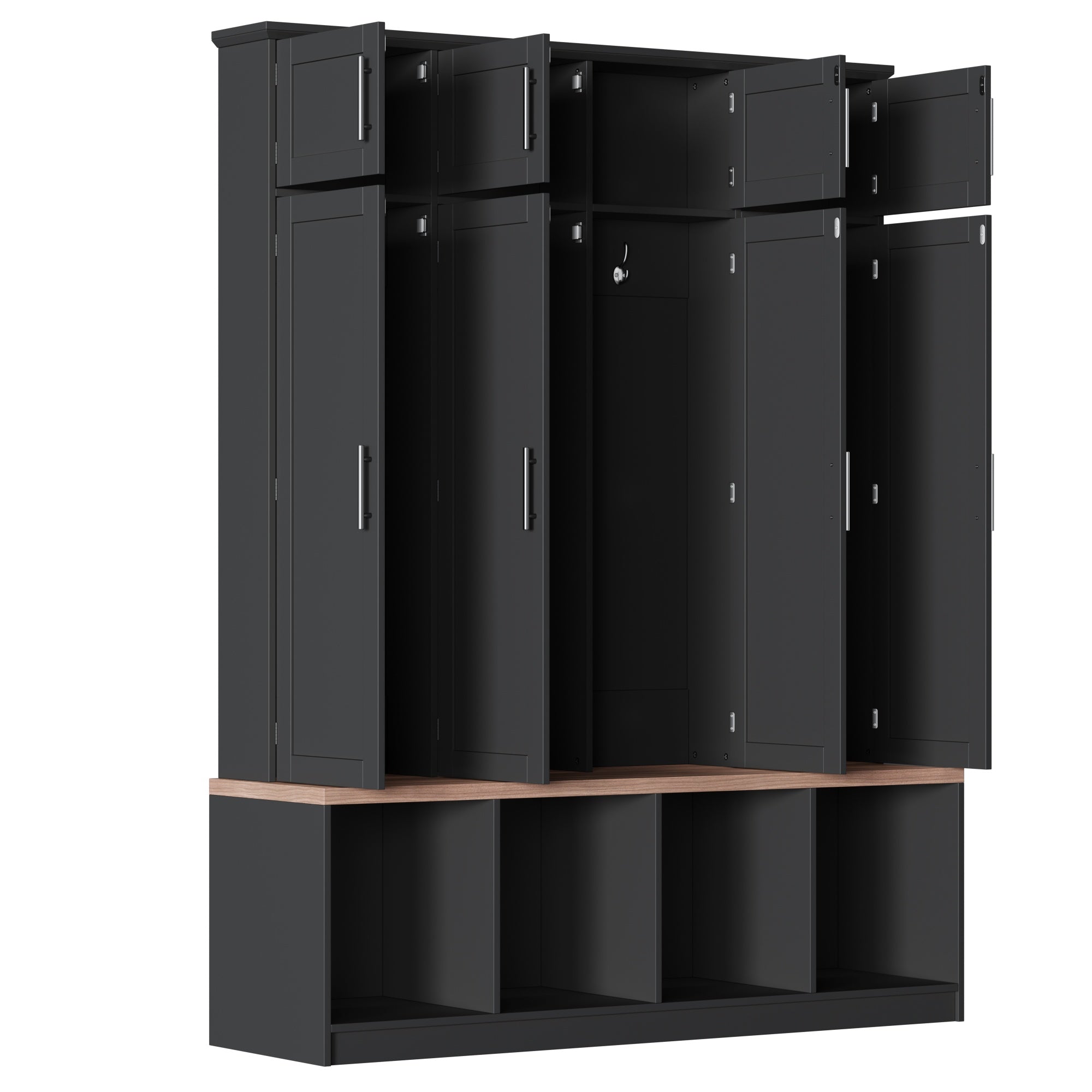 - 4‑in‑1 functionality: Combines a bench, 8-door shoe cabinet, 4 hidden hanging hooks, and 4 open bottom compartments for streamlined organization.
