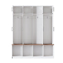Bring order and farmhouse charm to your entryway with this multi‑function hall tree. Thoughtfully designed to serve as a seating bench, shoe cabinet, hanging rack and general storage cabinet, it streamlines clutter and creates a welcoming landing spot for coats, bags, and footwear. Durable construction and a warm walnut bench top contrast with crisp white cabinetry for a clean, versatile look that fits mudrooms, foyers, and living rooms.