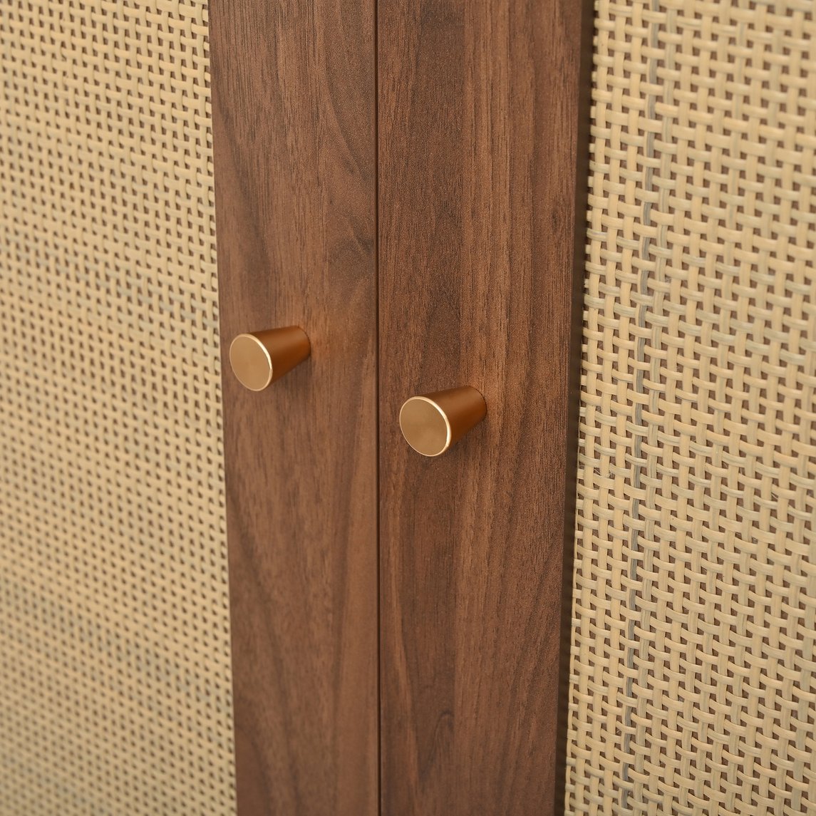 - Distinctive bohemian farmhouse look: Four woven rattan doors with gold handles and walnut veneer finish deliver organic texture and timeless appeal that complements many décor styles.