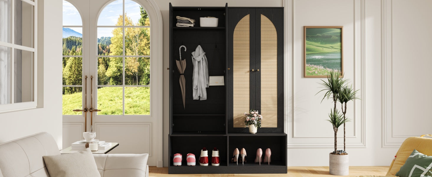 - 4-in-1 Functional Design: Bench seating, 6 wall-mounted hooks, 2 enclosed cabinets with rattan doors, plus open bottom compartments for shoes and baskets.