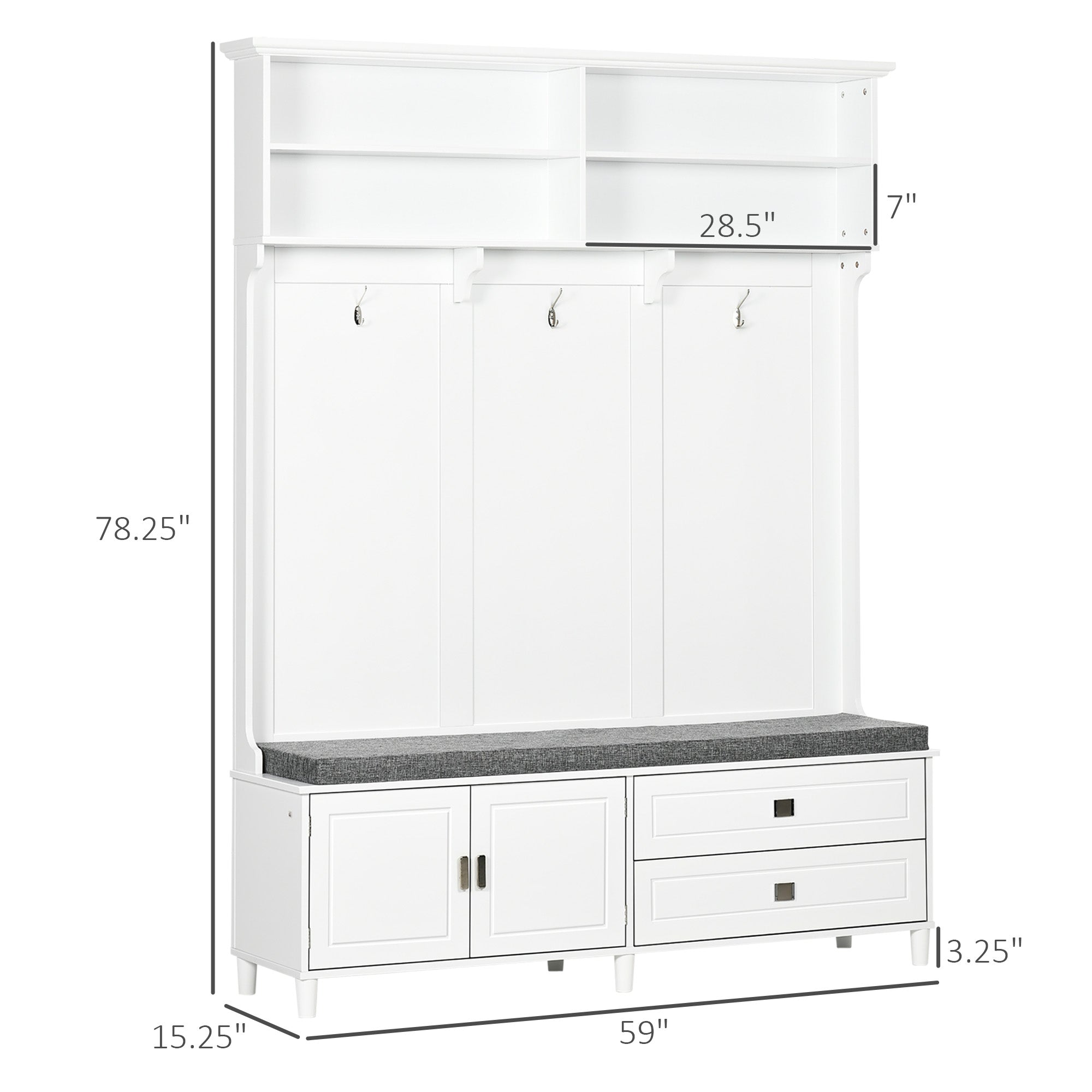 Bring order and style to your entryway with this versatile hall tree that combines seating, hanging storage, cabinets, and drawers in a clean white finish. Thoughtfully designed for busy homes, it creates a dedicated spot for coats, bags, shoes, and everyday accessories so arrivals and departures are quicker and neater. Durable MDF construction, multiple storage zones, and safety features make it a practical, family-friendly addition to a hallway, mudroom, or foyer.