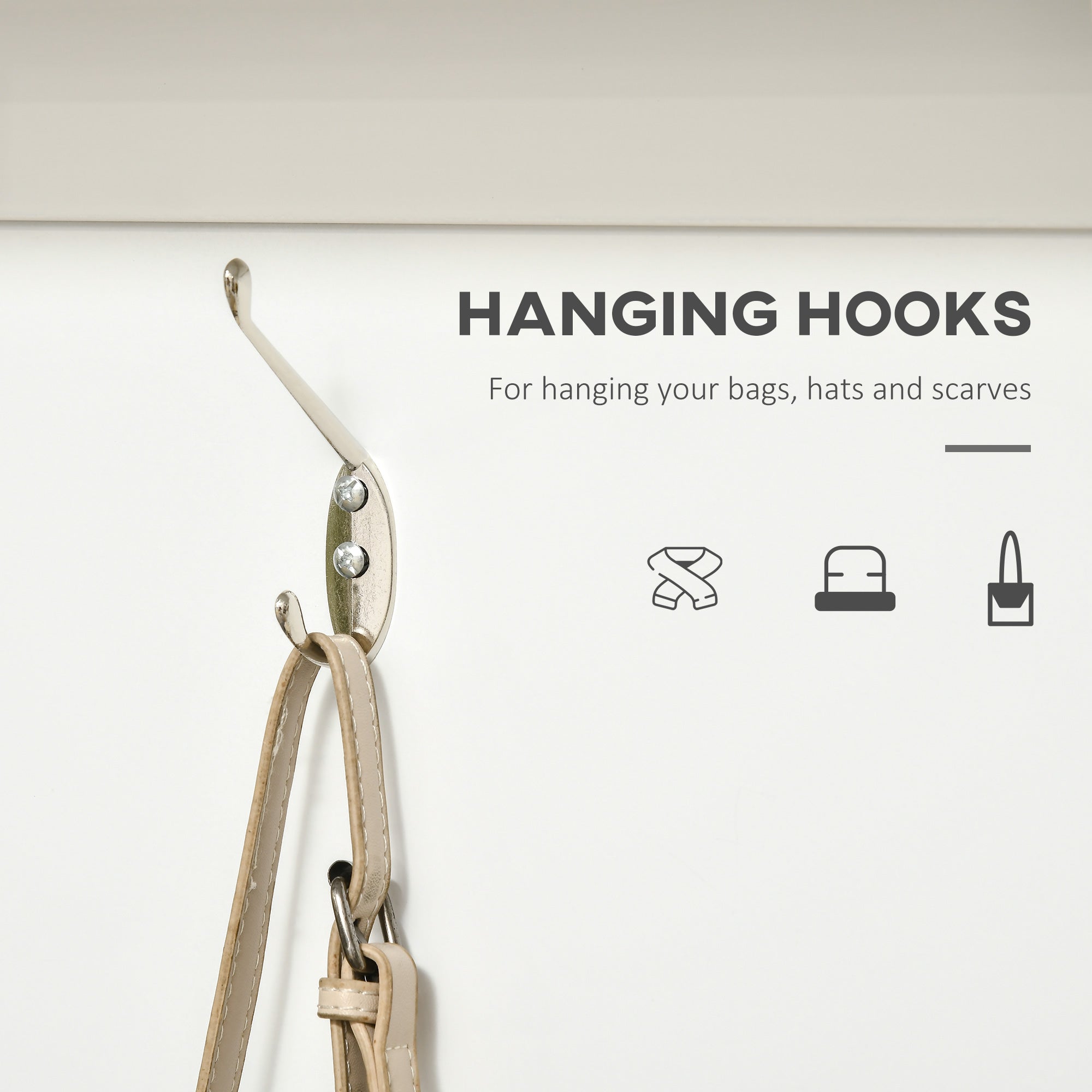 - Hanging storage: Three double hooks provide space for coats, bags, scarves, and leashes; an upper display shelf offers a spot for decor or frequently used items.