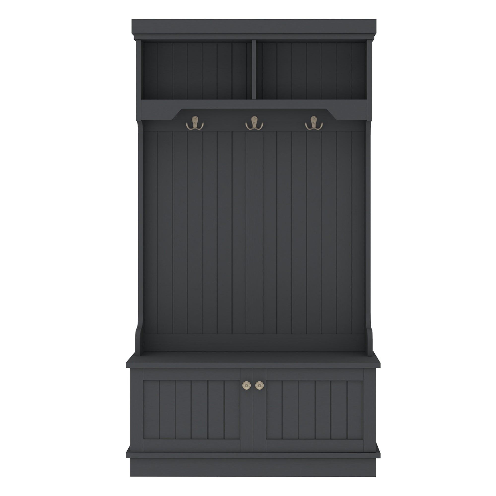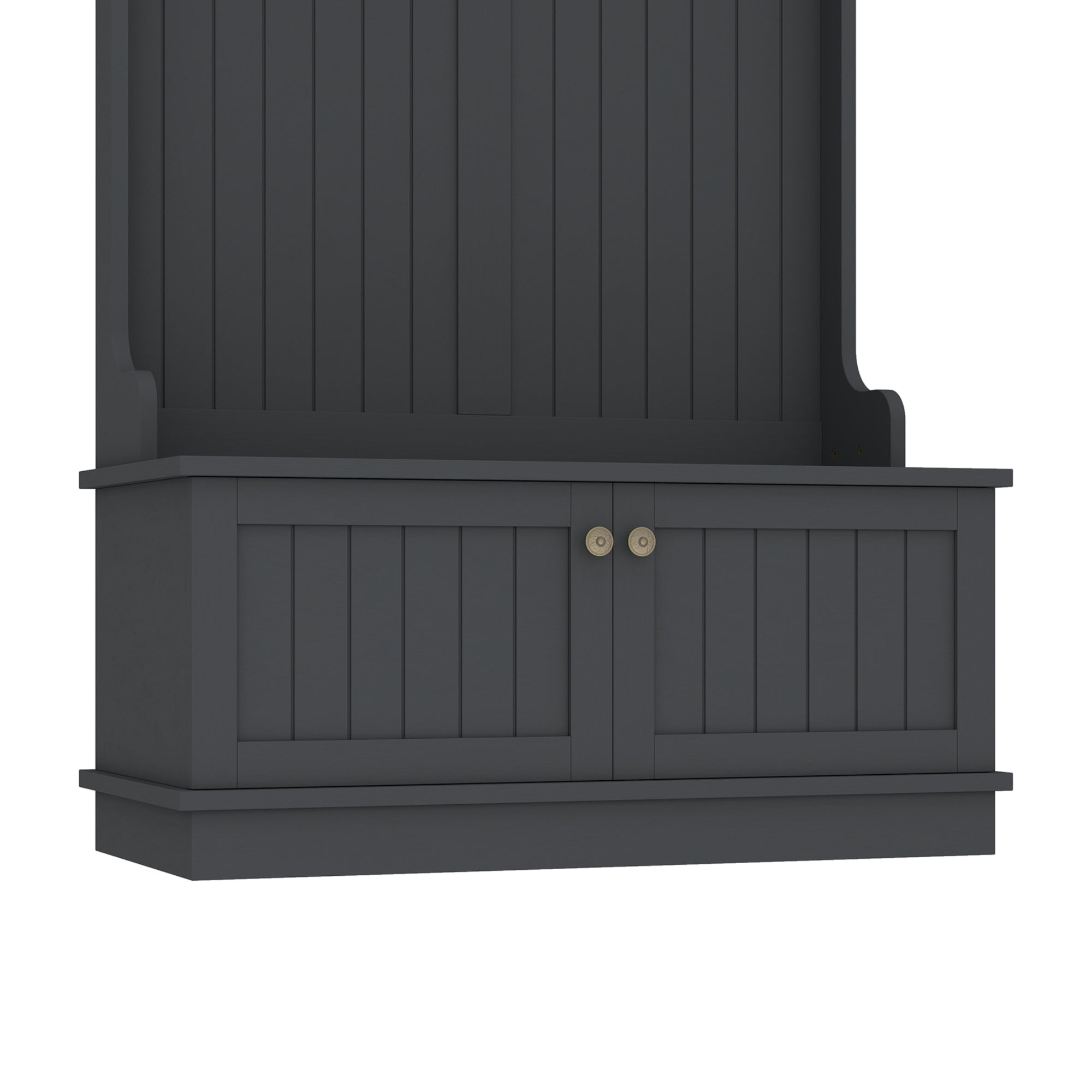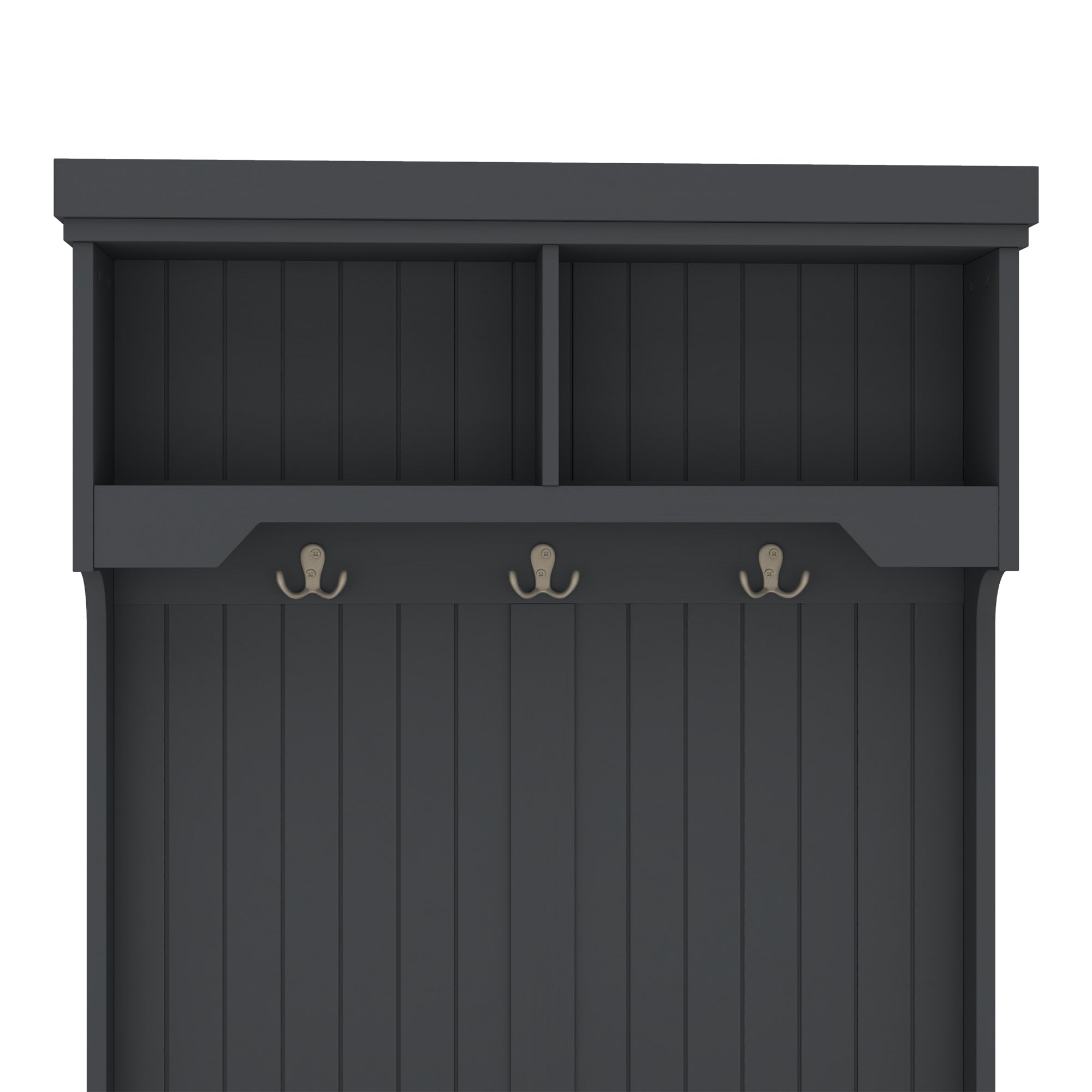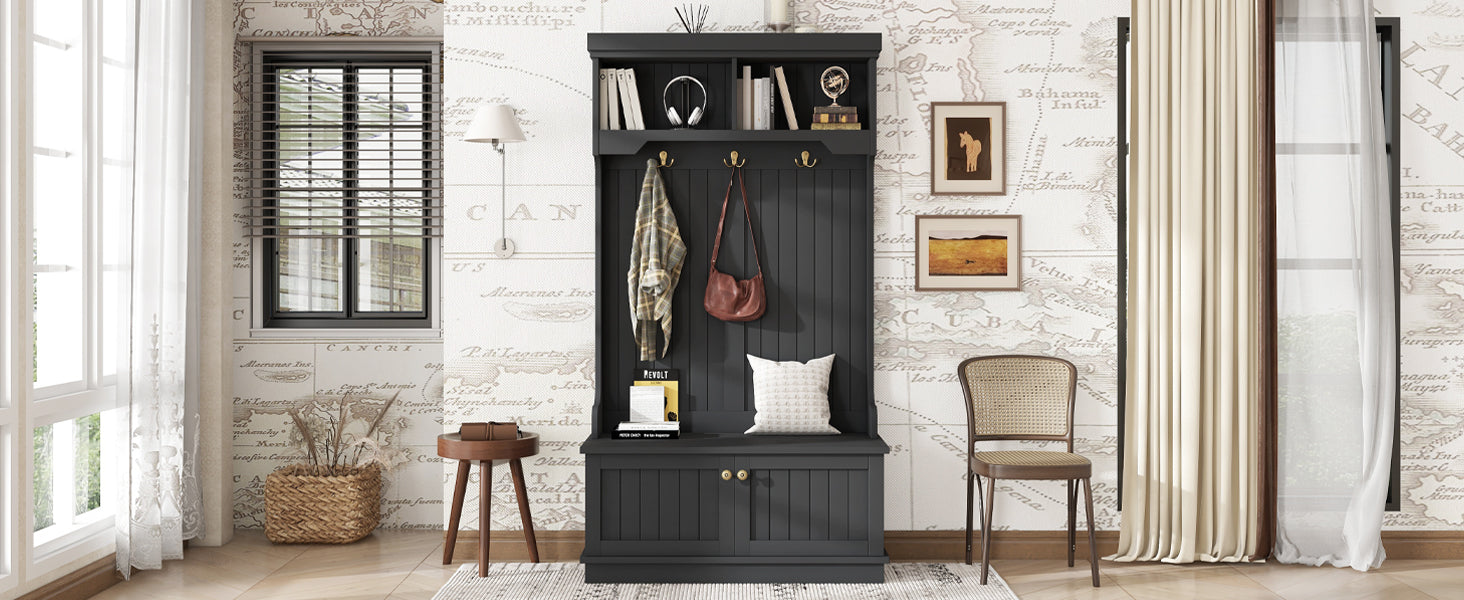 - 4-in-1 Design- This multifunctional hall tree is an Integrated coat rack with hooks, a shoe bench, a storage cabinet, and a display shelf, designed to fit for your entryway, laundry room, closet, bedroom, or mudroom use.