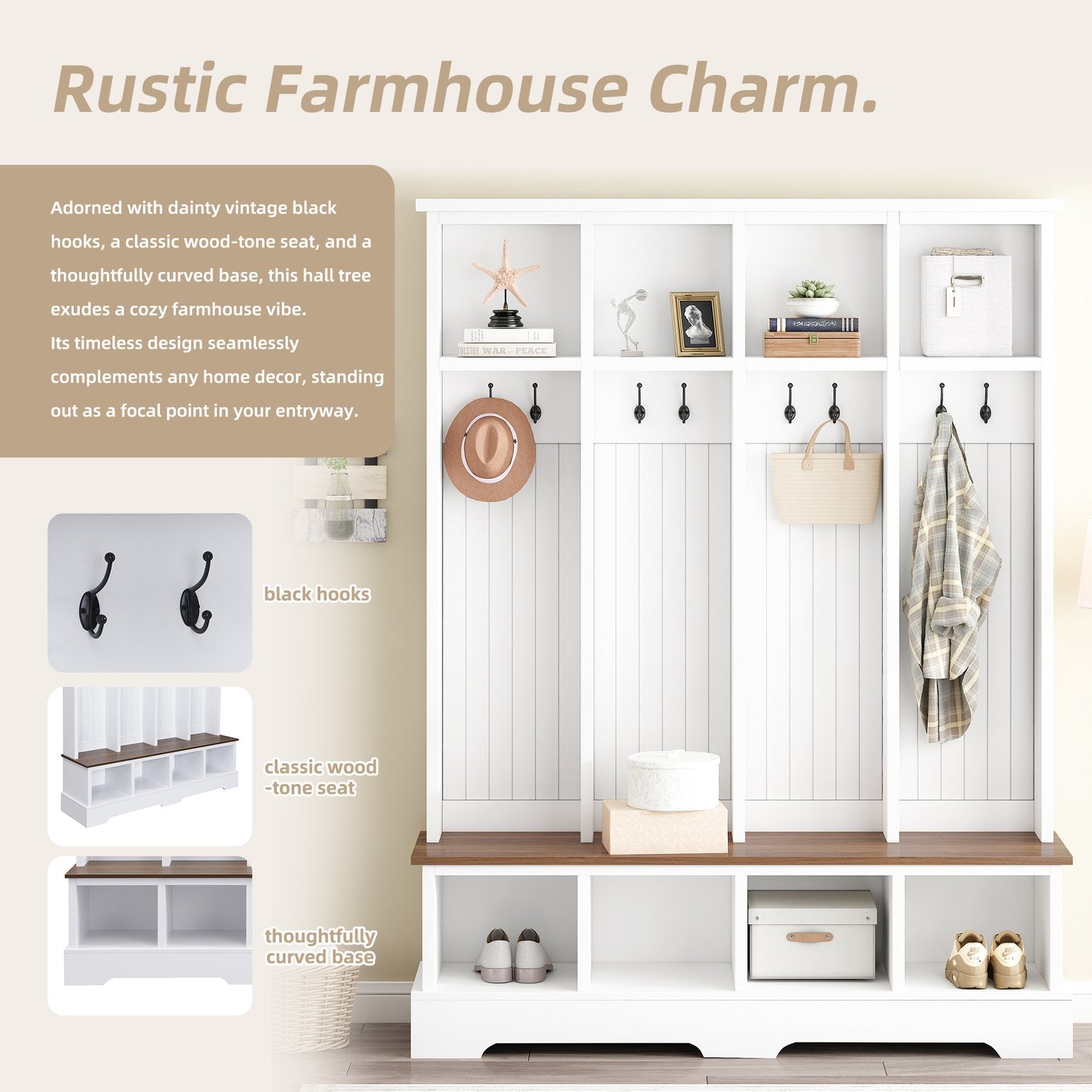 Bring farmhouse warmth and practical organization to your entryway with this stylish 3-in-1 hall tree. Combining a bench, coat hooks, and open compartments in a compact, modern silhouette, it offers a welcoming spot to sit, stash shoes, and hang outerwear while enhancing your home’s decor with vintage-inspired details and a walnut-tone seat.