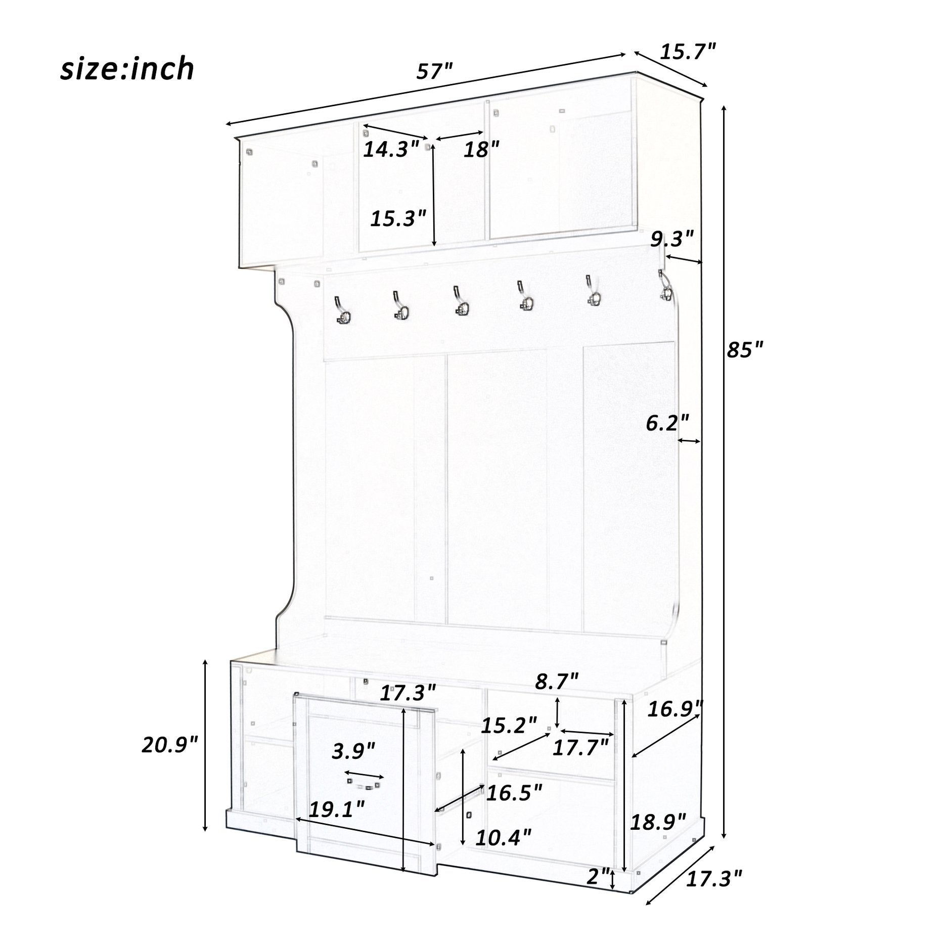 - Three upper shelves, perfect for displaying decorations, storing hats, or placing baskets for additional organization; Six sturdy hooks designed to hold jackets, scarves, bags, and other daily essentials; The comfortable shoe bench enhances the ease and fun of putting on and taking off shoes.