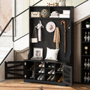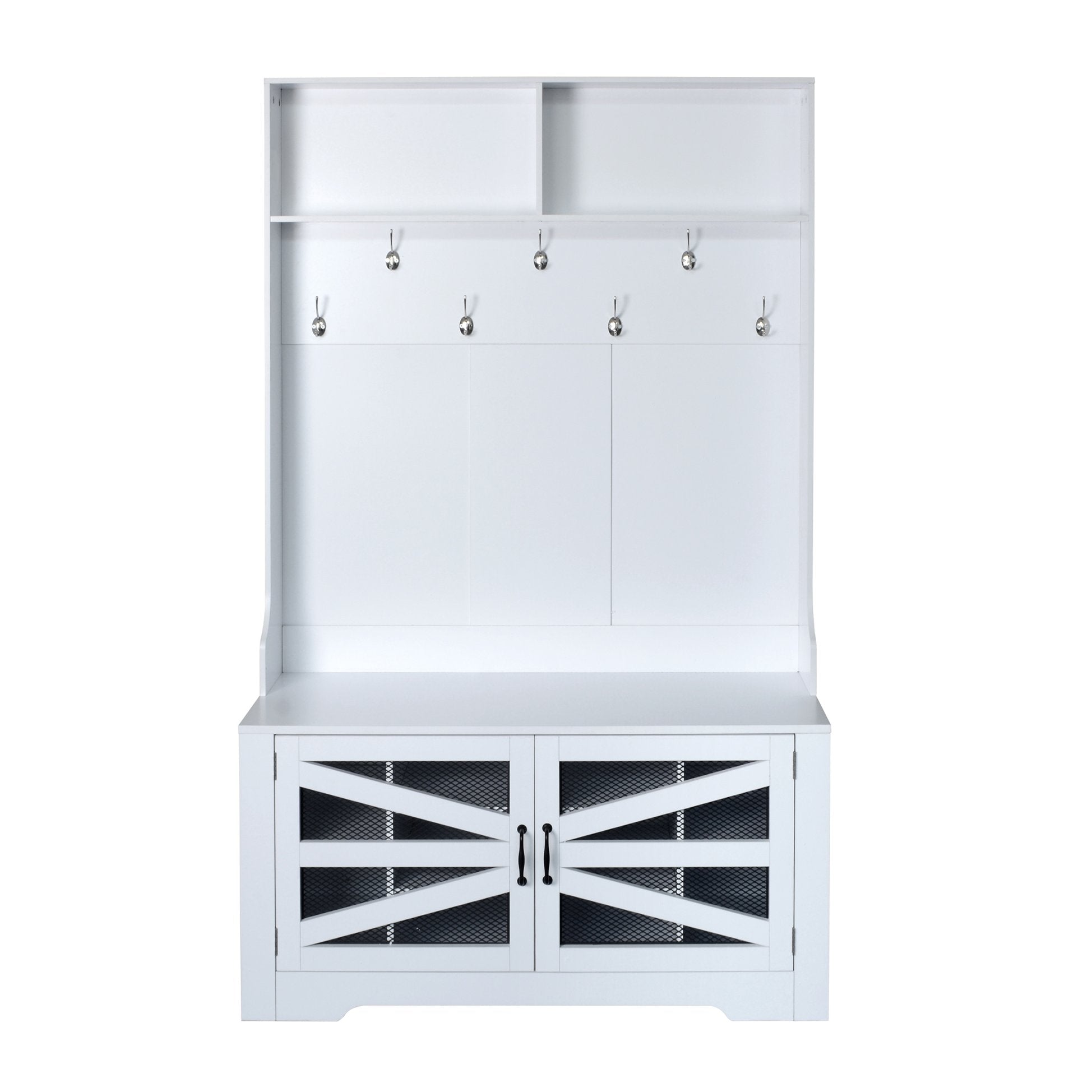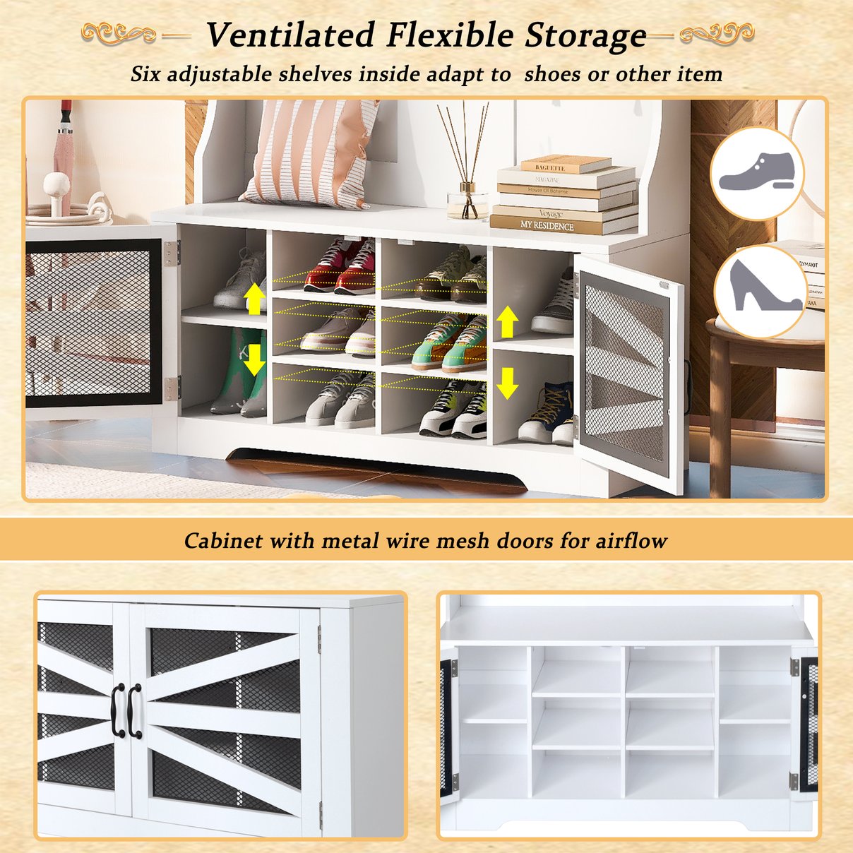 Bring order and style to your entryway with this 3-in-1 hall tree that combines seating, hanging storage, and enclosed shoe organization in a single, compact unit. Built from durable MDF with a ventilated mesh cabinet and seven heavy-duty hooks, it’s designed to streamline daily routines—providing a comfortable bench for putting on shoes, high and low shelves for display and essentials, and adjustable interior shelving for shoes, bags, or seasonal gear. Safety features and clear assembly instructions make setup straightforward and worry-free.