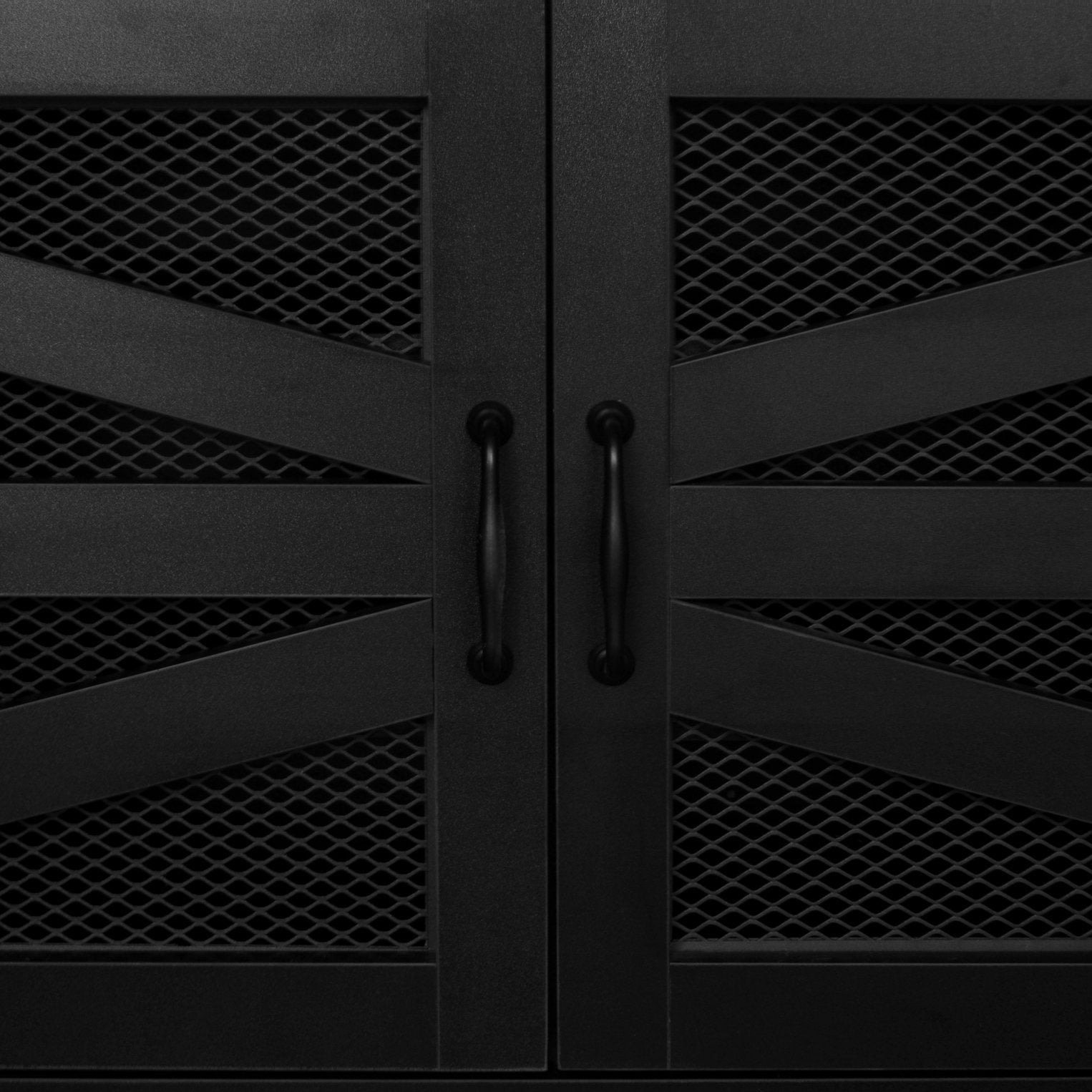 - Storage configuration: Two upper display shelves, a ventilated cabinet with six adjustable partitions and metal mesh doors, plus bilateral and middle shelf interiors sized for versatile storage.
