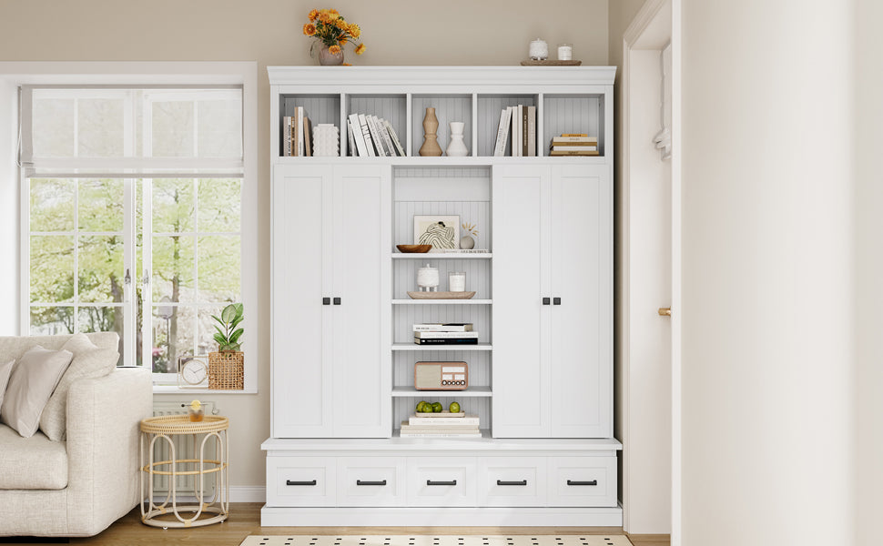 - Storage layout: 5 storage cubbies, 4 doors, 5 drawers and adjustable shelves for customizable organization