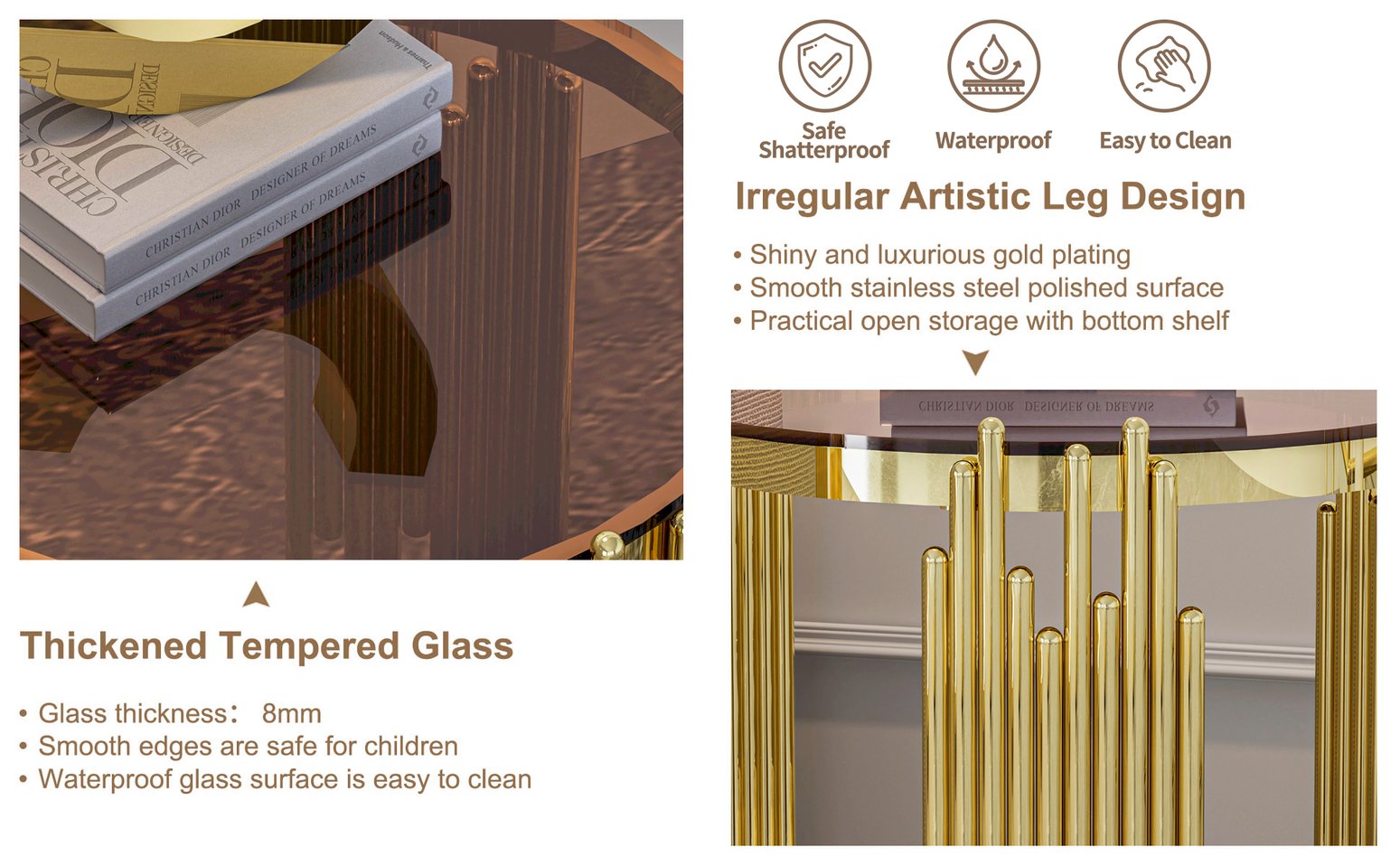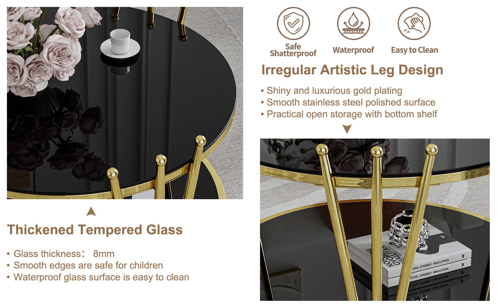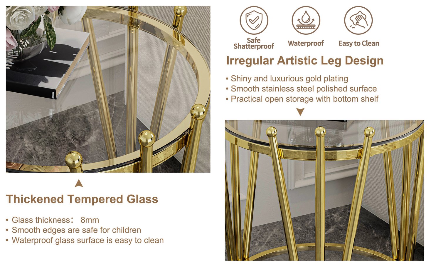 - Premium Materials: 8mm clear tempered glass top and shelf — waterproof, heat resistant, and safer with rounded edges; stainless steel frame in gold finish for long-lasting shine and corrosion resistance.