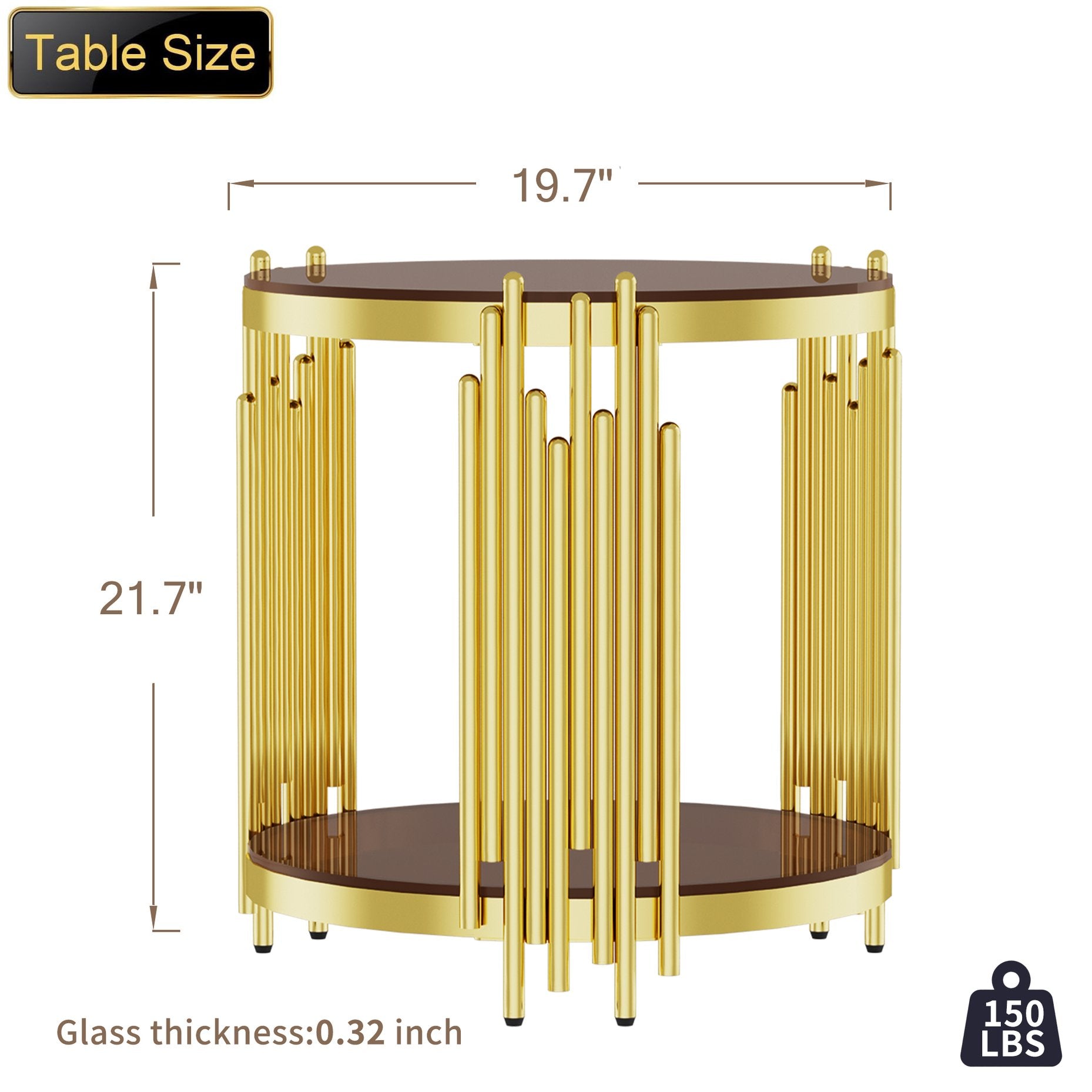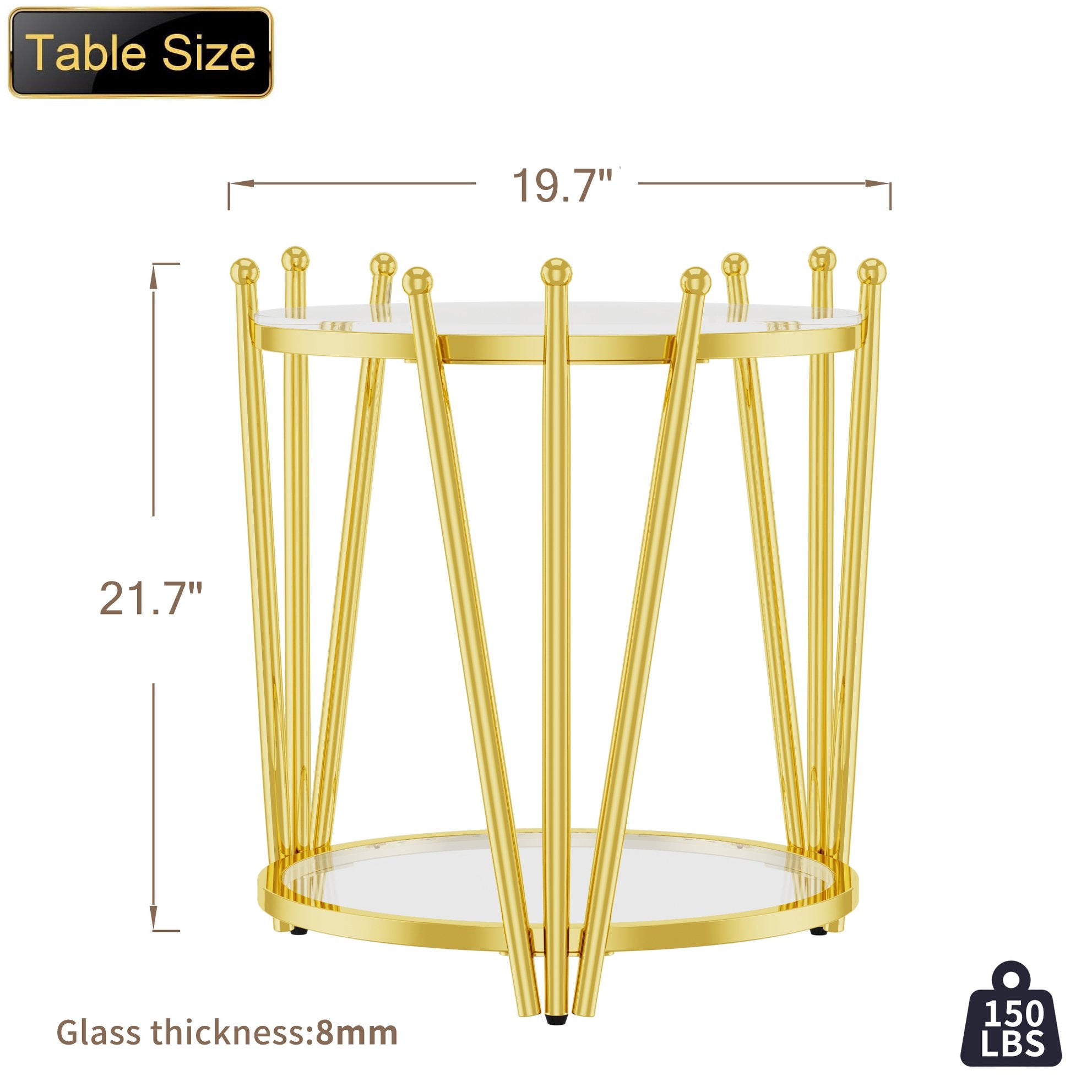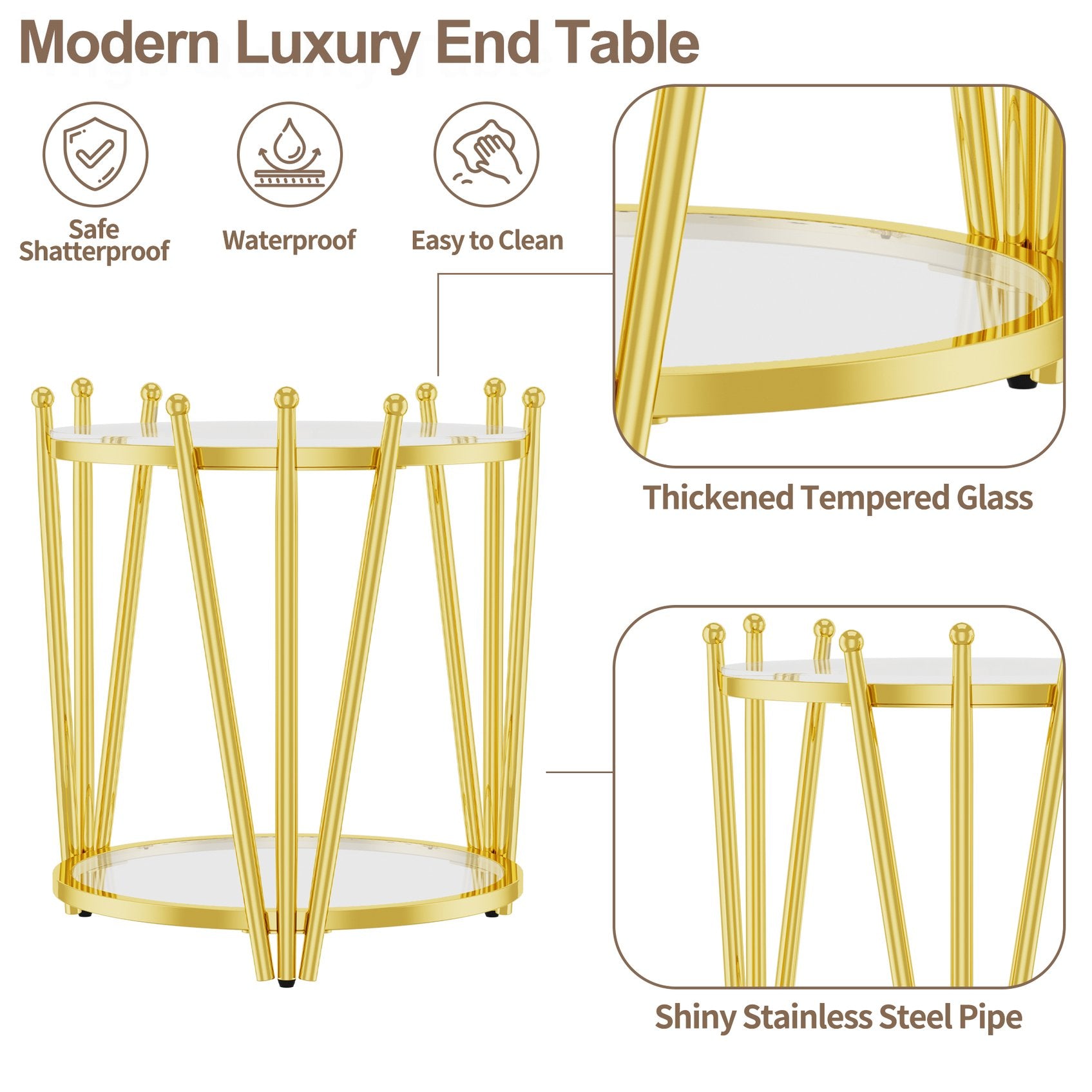 - Premium Materials: 8mm clear tempered glass top and shelf — waterproof, heat resistant, and safer with rounded edges; stainless steel frame in gold finish for long-lasting shine and corrosion resistance.