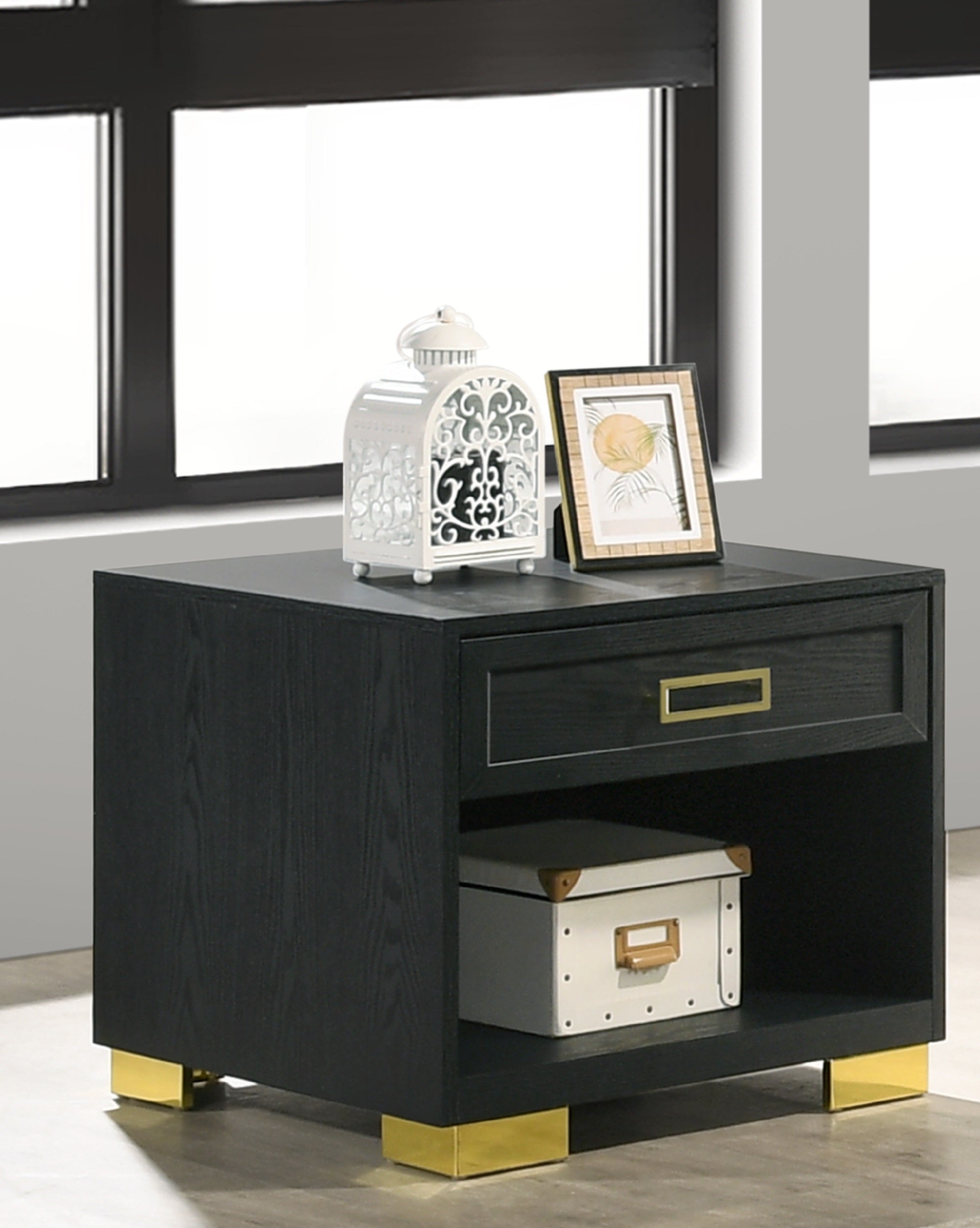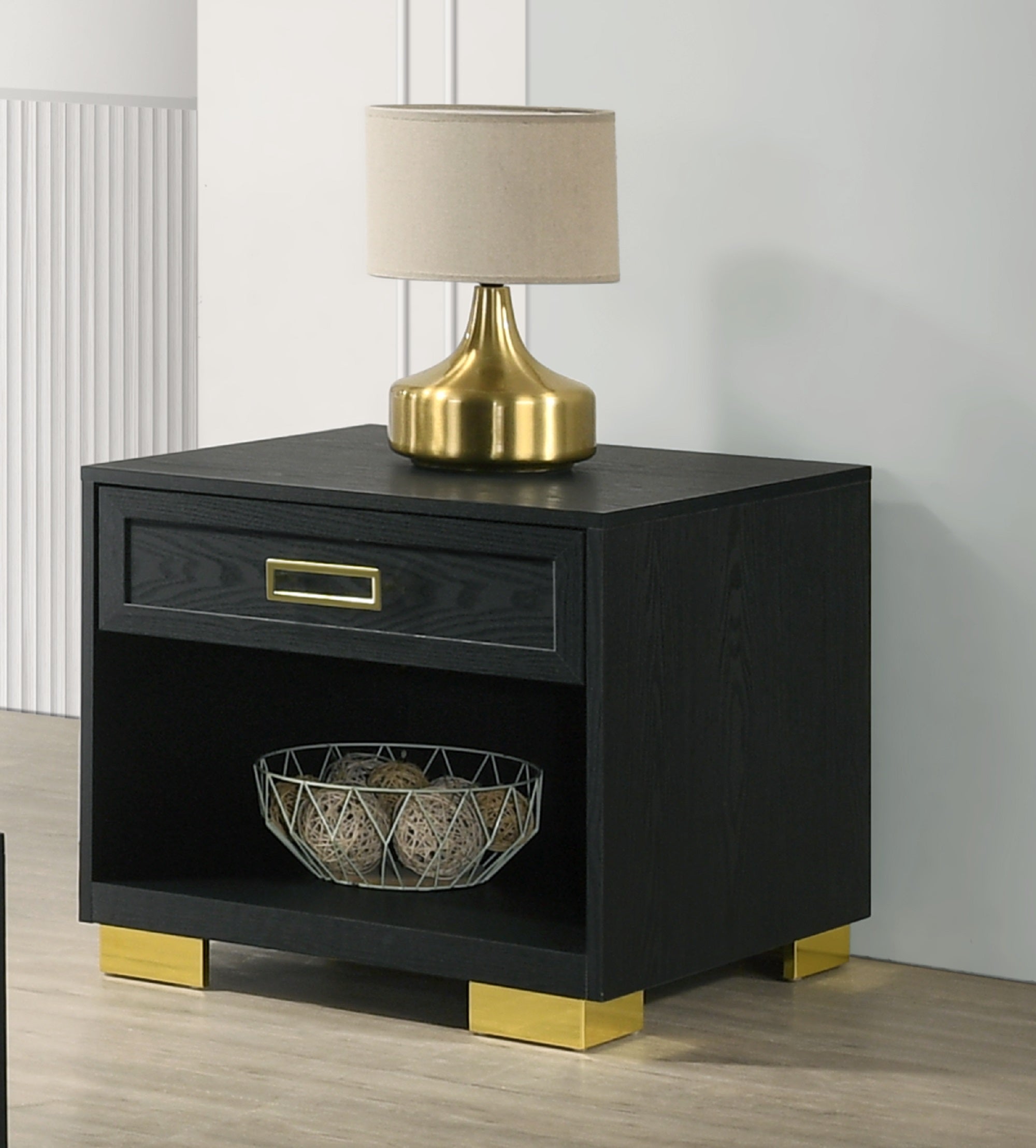 - Finish: Matte black surface with contrasting gold metal pull knobs for a luxurious accent